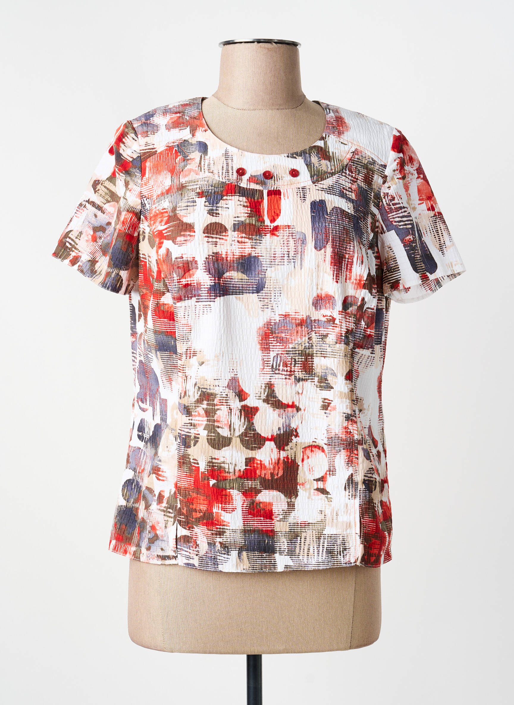Profitez d’un bon plan mode avec ce T-shirt pour femme signé FRANCE RIVOIRE, idéal pour réveiller votre dressing sans vous ruiner?! Son imprimé artistique mêle habilement des touches de rouge, de bleu et de beige sur un fond blanc, offrant un style à la fois original et facile à porter au quotidien. Sa coupe droite classique le rend confortable, tandis que les détails de texture donnent une touche raffinée et moderne. Ce T-shirt tendance combine allure unique et petit prix, parfait pour se faire plaisir à moindre coût.