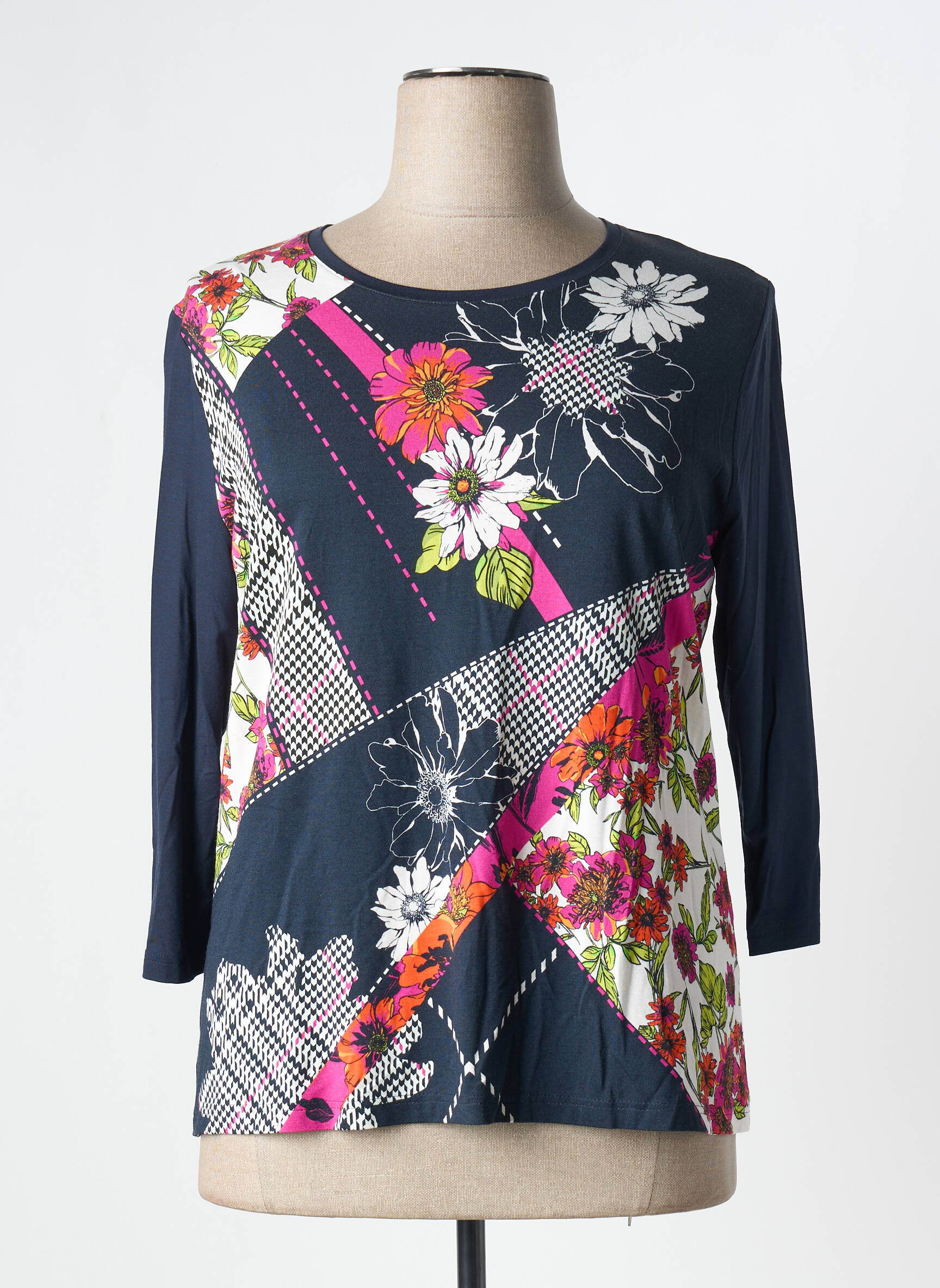 Voici une véritable affaire à saisir avec ce T-shirt FRANK WALDER pour femme, qui offre un look pétillant à petit prix grâce à son imprimé floral éclatant mêlé à des touches graphiques colorées sur un fond sombre très tendance. La coupe confortable à manches trois-quarts en fait un choix parfait pour dynamiser votre garde-robe sans vous ruiner.