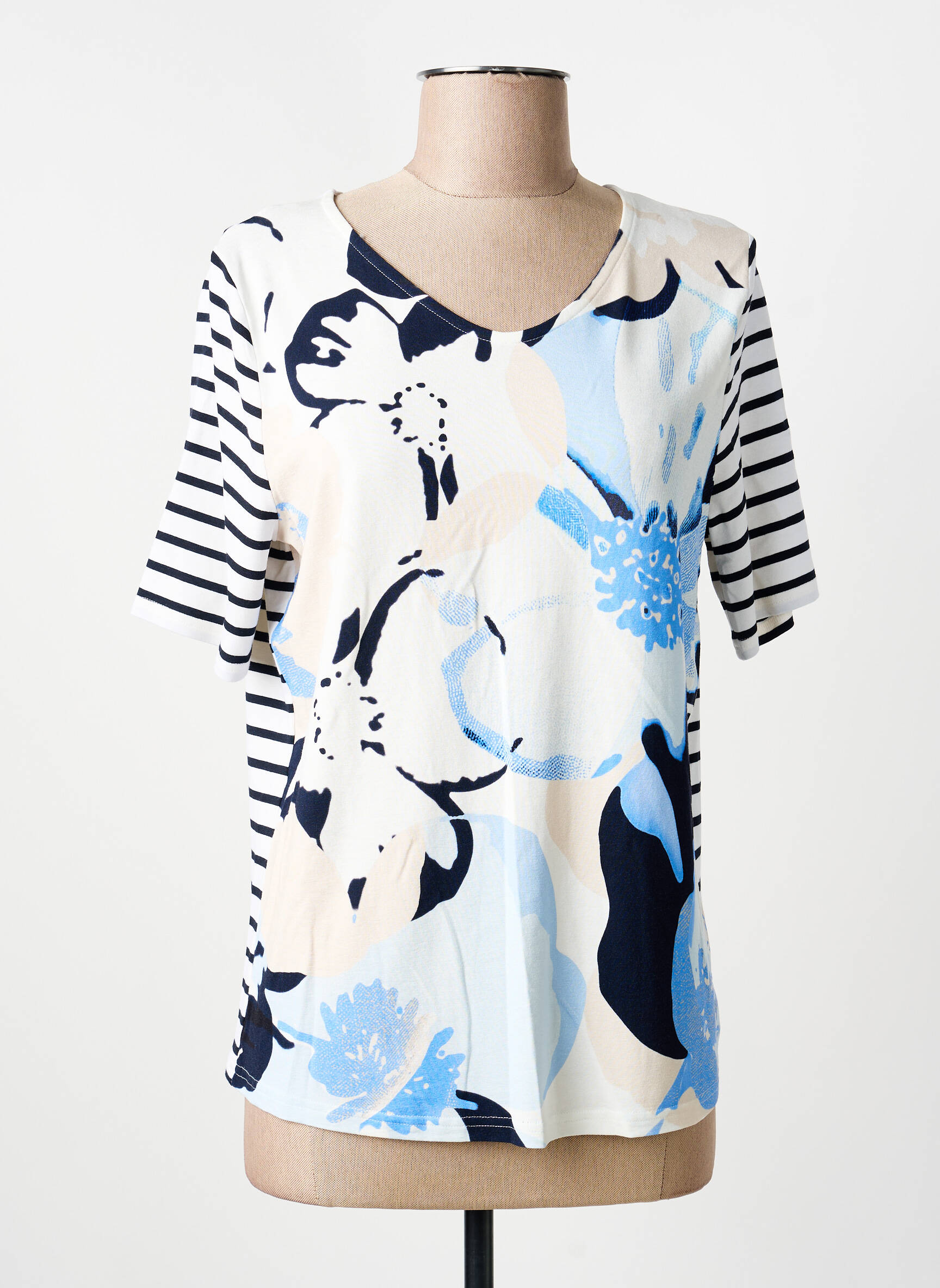 Profitez d'une véritable affaire avec ce T-shirt pour femme de la marque FRANK WALDER, qui allie élégance et petit prix. Ce modèle séduit par son imprimé floral aux nuances de bleu et de beige, subtilement rehaussé de manches à rayures contrastantes, offrant un look dynamique et moderne idéal pour dynamiser votre tenue quotidienne tout en réalisant de belles économies.