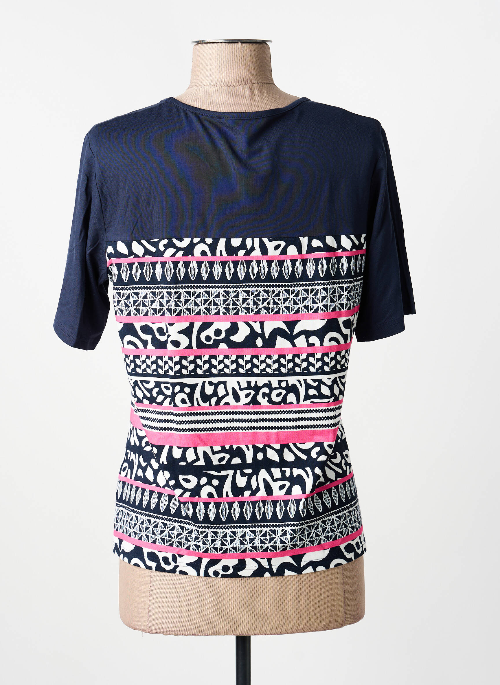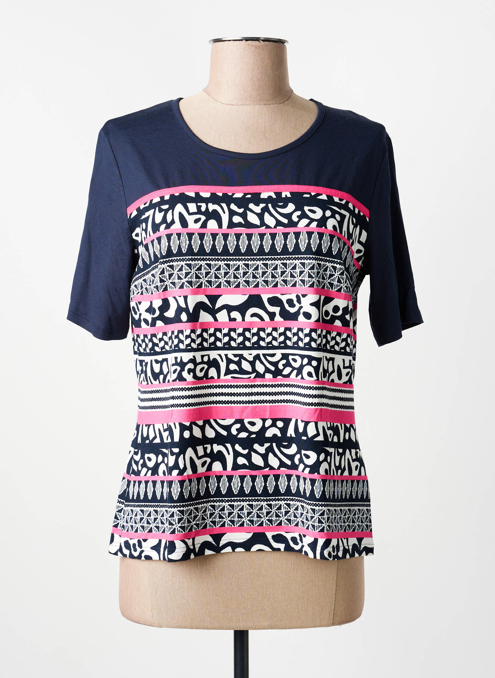 Profitez d’un vrai bon plan avec ce T-shirt FRANK WALDER pour femme, qui allie originalité et petit prix. Ce modèle séduit par son imprimé graphique multicolore relevé de touches de rose et de motifs contrastés, tout en offrant un look moderne et facile à porter au quotidien. Les manches courtes et la coupe droite assurent un confort optimal, parfait pour renouveler votre garde-robe à moindre coût. Saisissez l'occasion de vous offrir une pièce tendance à prix malin.