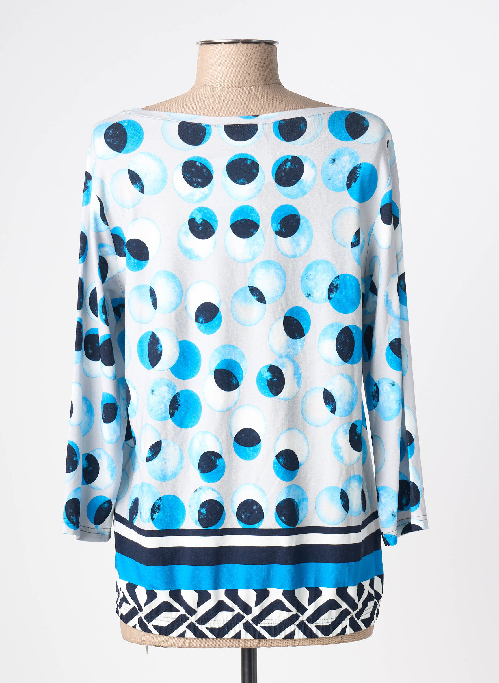 Profitez d’un bon plan mode avec ce T-shirt FRANK WALDER pour femme au style graphique et original, parfait pour apporter une touche de fraîcheur à votre garde-robe sans vous ruiner. Son imprimé à pois dans les tons bleu et turquoise, rehaussé par des motifs géométriques contrastés sur le bas, met en valeur une allure moderne et dynamique, tout en offrant un confort idéal au quotidien. Saisissez l’occasion de vous faire plaisir avec une pièce tendance à prix tout doux.