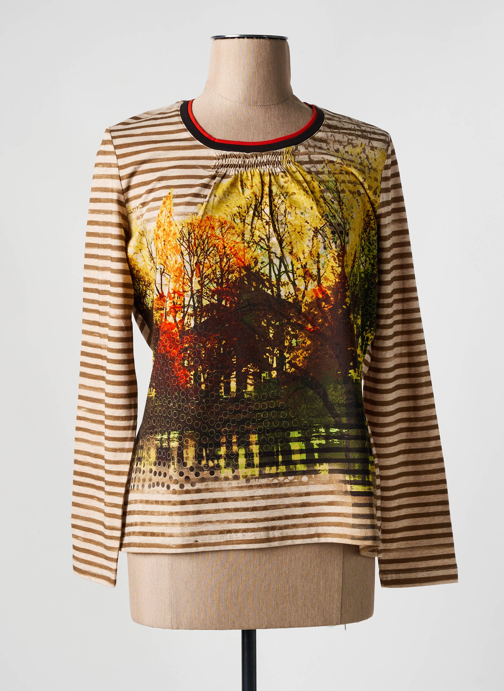 Profitez d’un véritable bon plan avec ce T-shirt pour femme signé FRANK WALDER, parfait pour apporter une touche artistique à votre garde-robe sans vous ruiner. Son imprimé paysage automnal mêle harmonieusement des tons chauds et naturels tandis que les manches rayées ajoutent un style original à la silhouette. Idéal pour celles qui souhaitent allier tendance et économies, ce modèle unique est le coup de cœur du déstockage avec un excellent rapport qualité-prix.