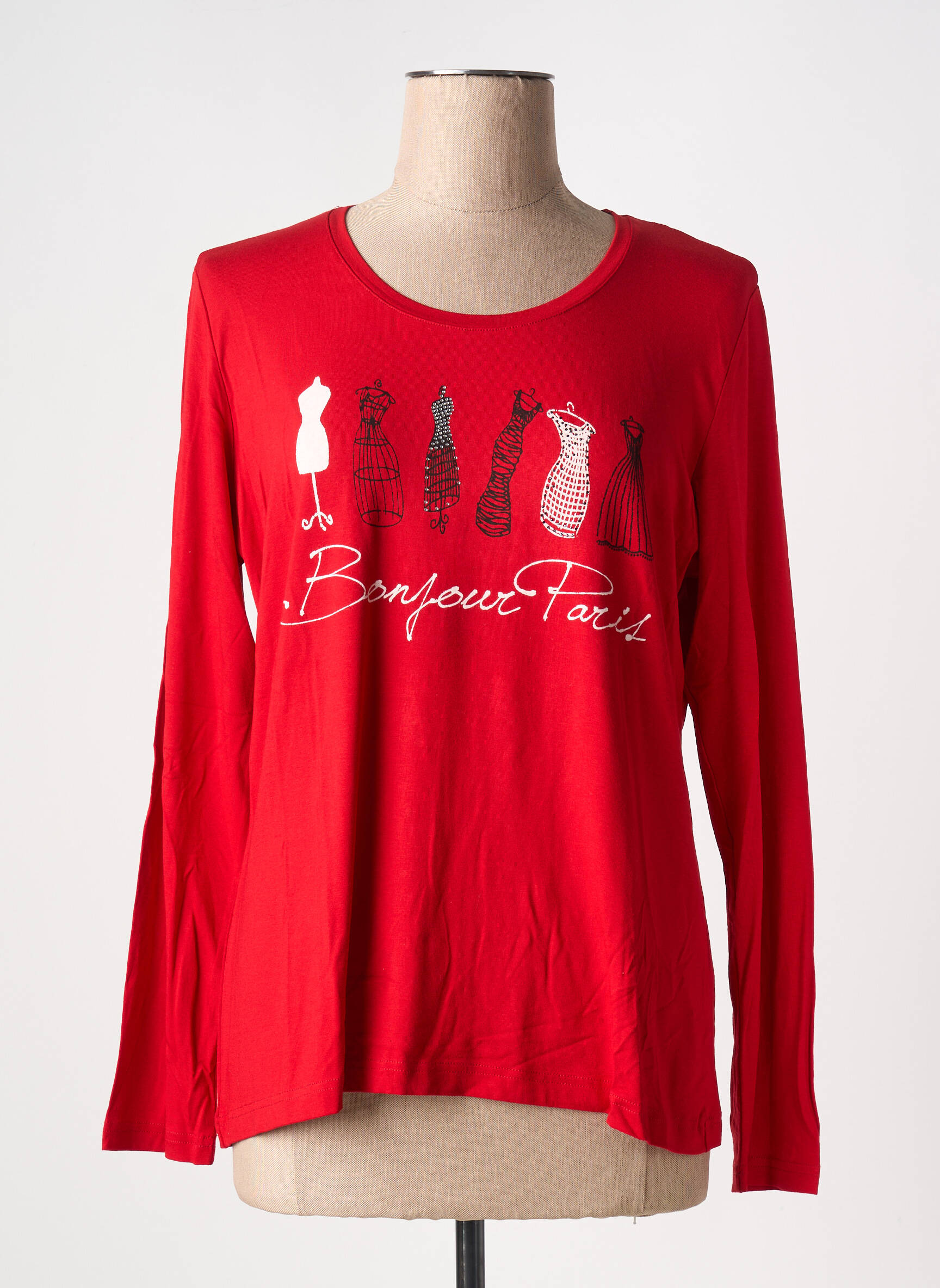 Offrez-vous une pièce de créateur à prix tout doux avec ce T-shirt FRANK WALDER pour femme, parfait pour donner du peps à votre dressing sans vous ruiner. Sa coupe fluide met en valeur toutes les silhouettes, tandis que son rouge éclatant attire le regard et apporte une touche de bonne humeur. Le motif original de robes stylisées accompagné de l'inscription "Bonjour Paris" ajoute une note de chic parisien, idéale pour affirmer votre style en toute simplicité. Profitez de ce bon plan pour adopter une pièce tendance à prix mini.
