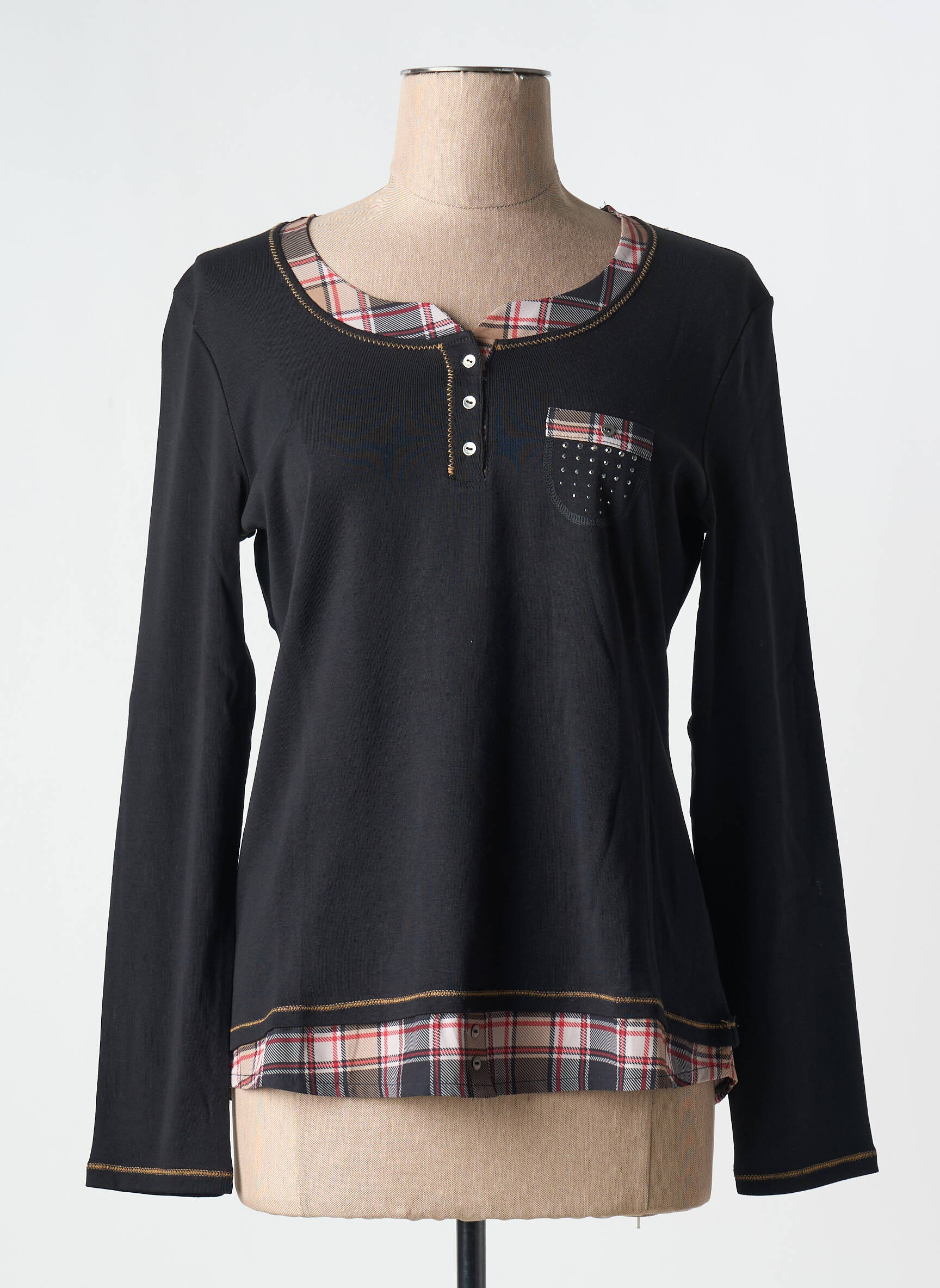 Craquez pour ce T-shirt femme FRONT DE MER à prix mini, un vrai bon plan pour renouveler votre dressing sans vous ruiner. Son style original mélange la simplicité du noir à des détails en tissu à carreaux au col, à la poche poitrine et à la base, pour une touche tendance qui se démarque. Sa coupe confortable à manches longues et sa patte de boutonnage sur le devant rendent ce haut parfait pour un look casual-chic au quotidien, tout en profitant d'une belle économie.