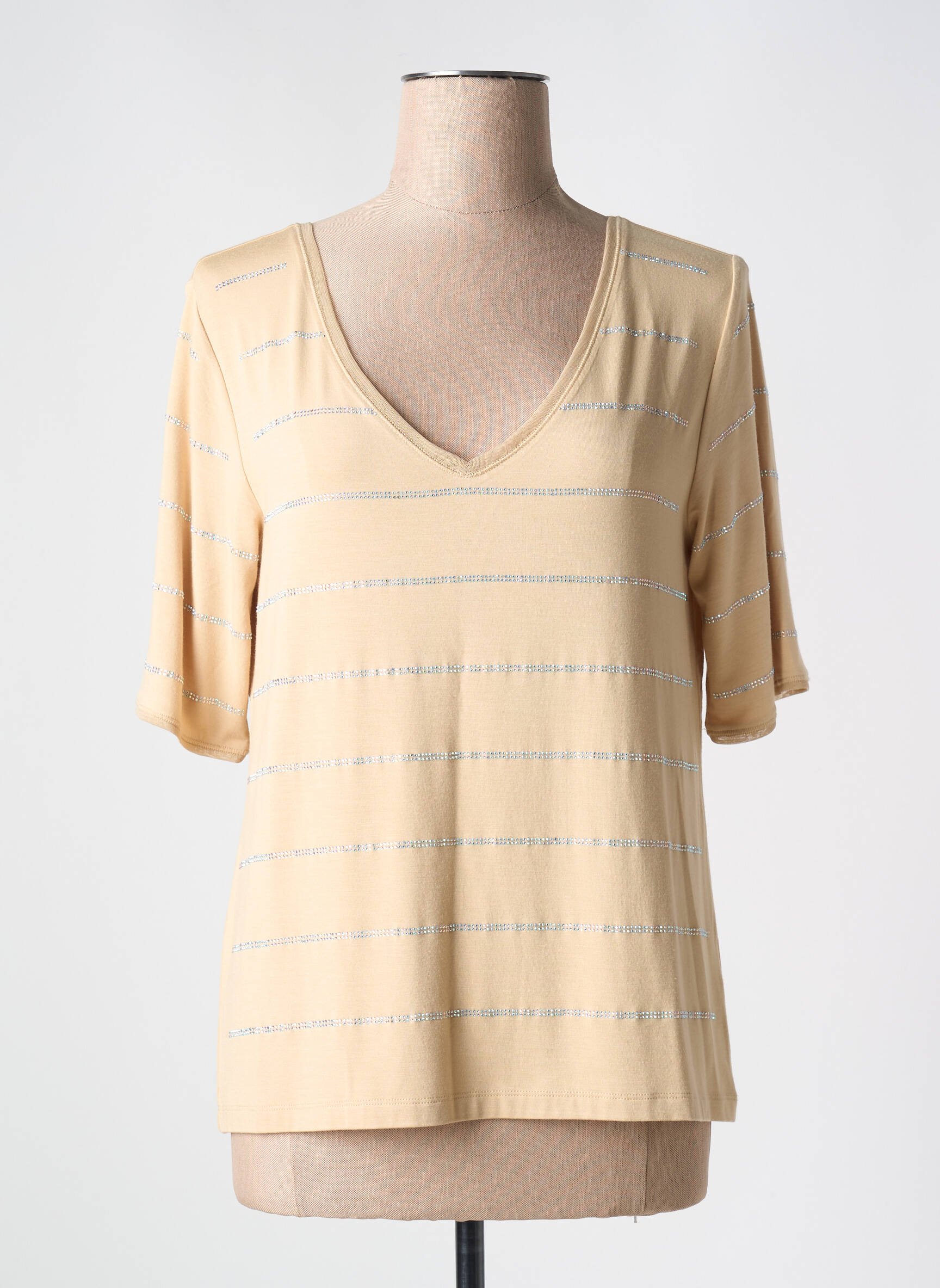 Craquez pour ce T-shirt FUEGO WOMAN à prix mini, une vraie opportunité pour dynamiser votre dressing sans vous ruiner. Ce modèle féminin séduit par sa douceur et son coloris beige lumineux rehaussé de fines rayures argentées qui attrapent subtilement la lumière. Sa coupe droite et son joli décolleté en V apportent une touche moderne et flatteuse, idéale pour accompagner un jean ou une jupe tout en profitant d'une bonne affaire tendance et confortable.