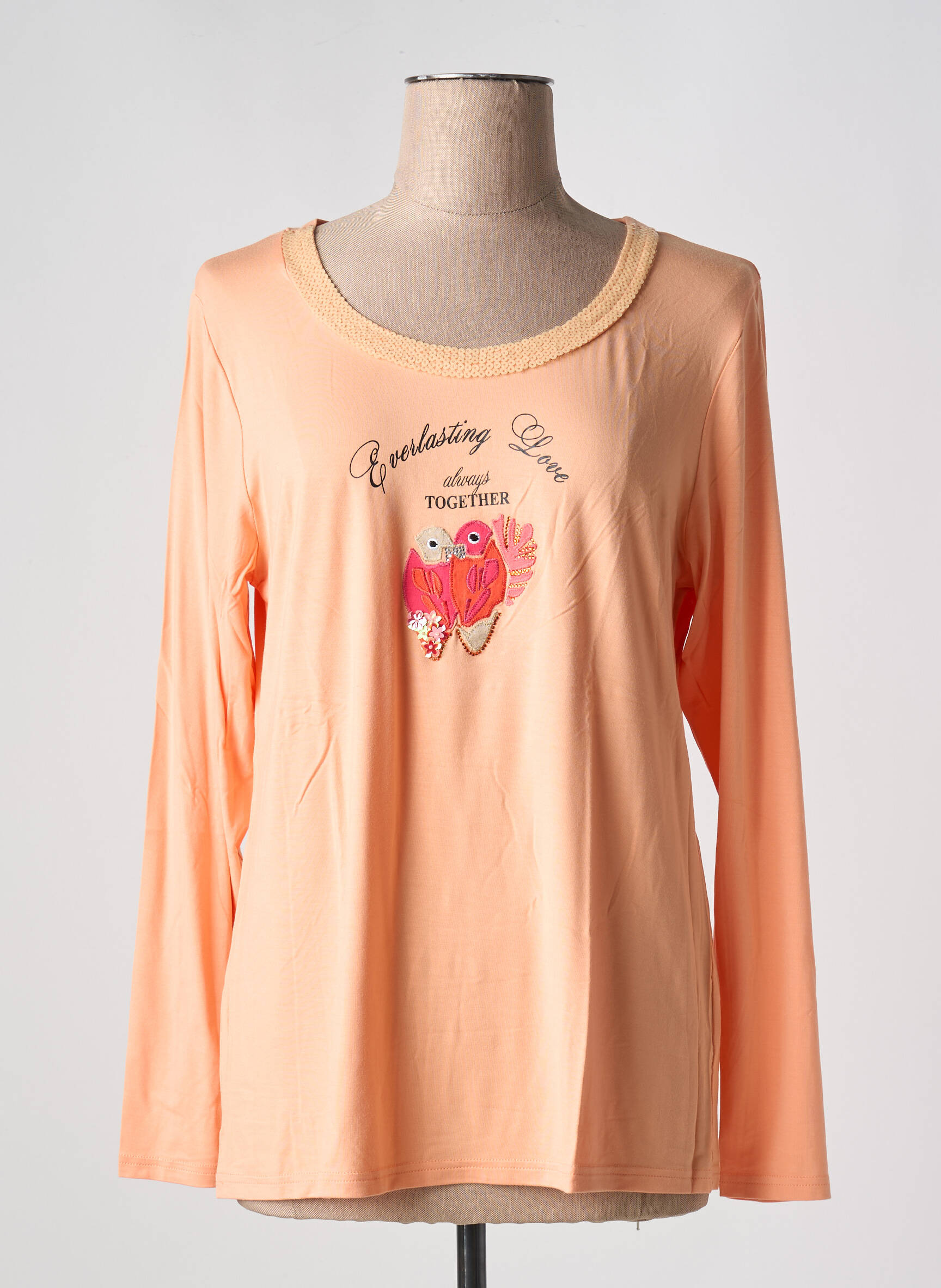Profitez d’une pièce tendance à prix mini avec ce T-shirt FUEGO WOMAN pour femme, parfait pour allier style et économies. Son coloris pêche lumineux apporte une touche de douceur à votre tenue, tandis que le motif central orné de deux oiseaux et le message “Everlasting love, always together” ajoutent une note originale et féminine. Les manches longues et l’encolure ronde délicatement contrastée offrent un confort idéal au quotidien. À petit prix, ce T-shirt est une belle opportunité pour renouveler votre dressing sans se ruiner.