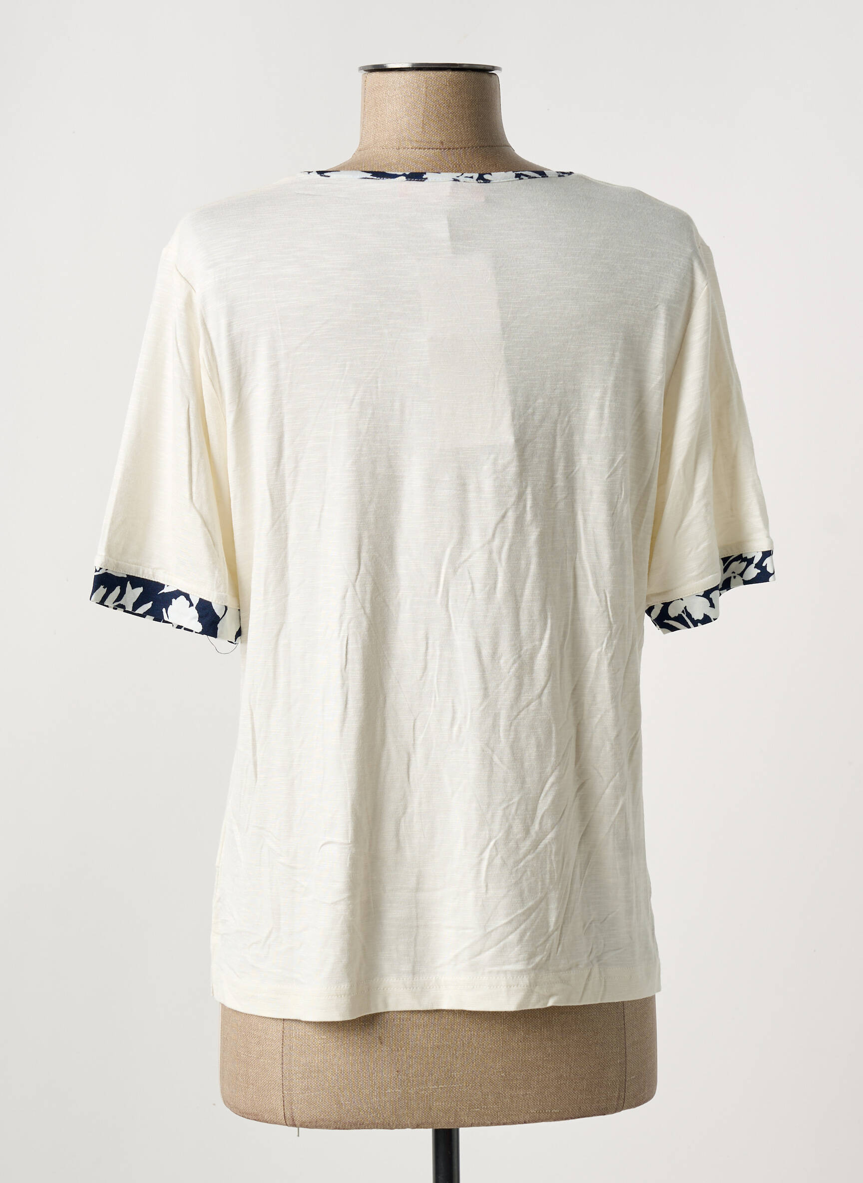 Profitez d'une belle opportunité pour renouveler votre dressing à petit prix avec ce T-shirt GRIFFON pour femme, au style sobre et élégant. Sa couleur crème lumineuse s’accorde facilement avec tous vos bas, tandis que le col rond et les bordures des manches sont subtilement rehaussés d’un imprimé bleu marine, apportant une touche tendance et originale sans en faire trop. Une pièce confortable et facile à porter au quotidien, idéale pour celles qui recherchent la qualité d'une grande marque à prix mini.