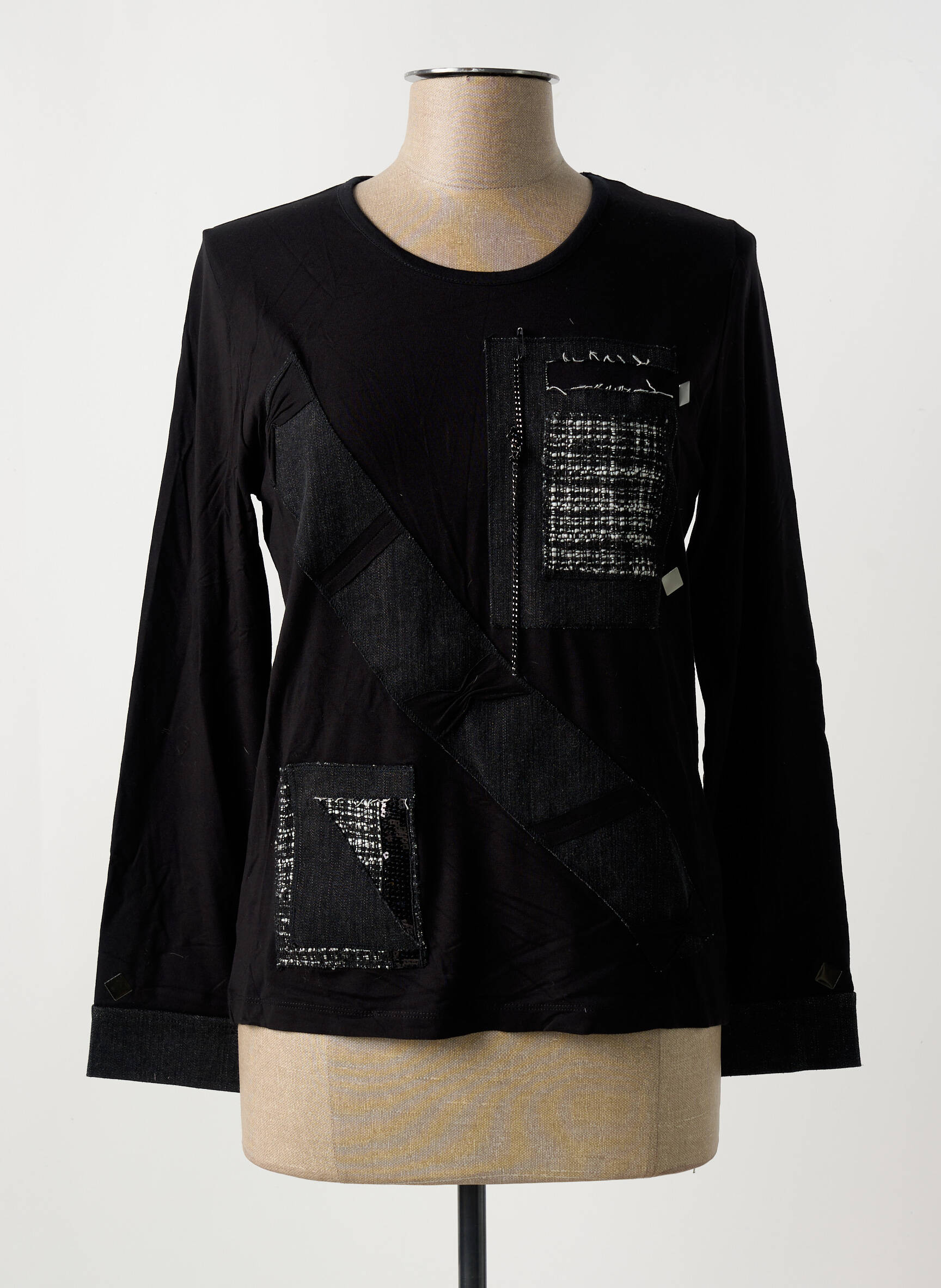 Saisissez l'occasion de vous offrir ce T-shirt GRIFFON pour femme à prix mini, un choix parfait pour associer style et économies. Ce modèle noir séduit par ses détails originaux : des empiècements effet patchwork décorés de touches contrastantes et de motifs texturés qui lui donnent une allure moderne et décontractée, idéale pour twister vos tenues du quotidien sans vous ruiner.