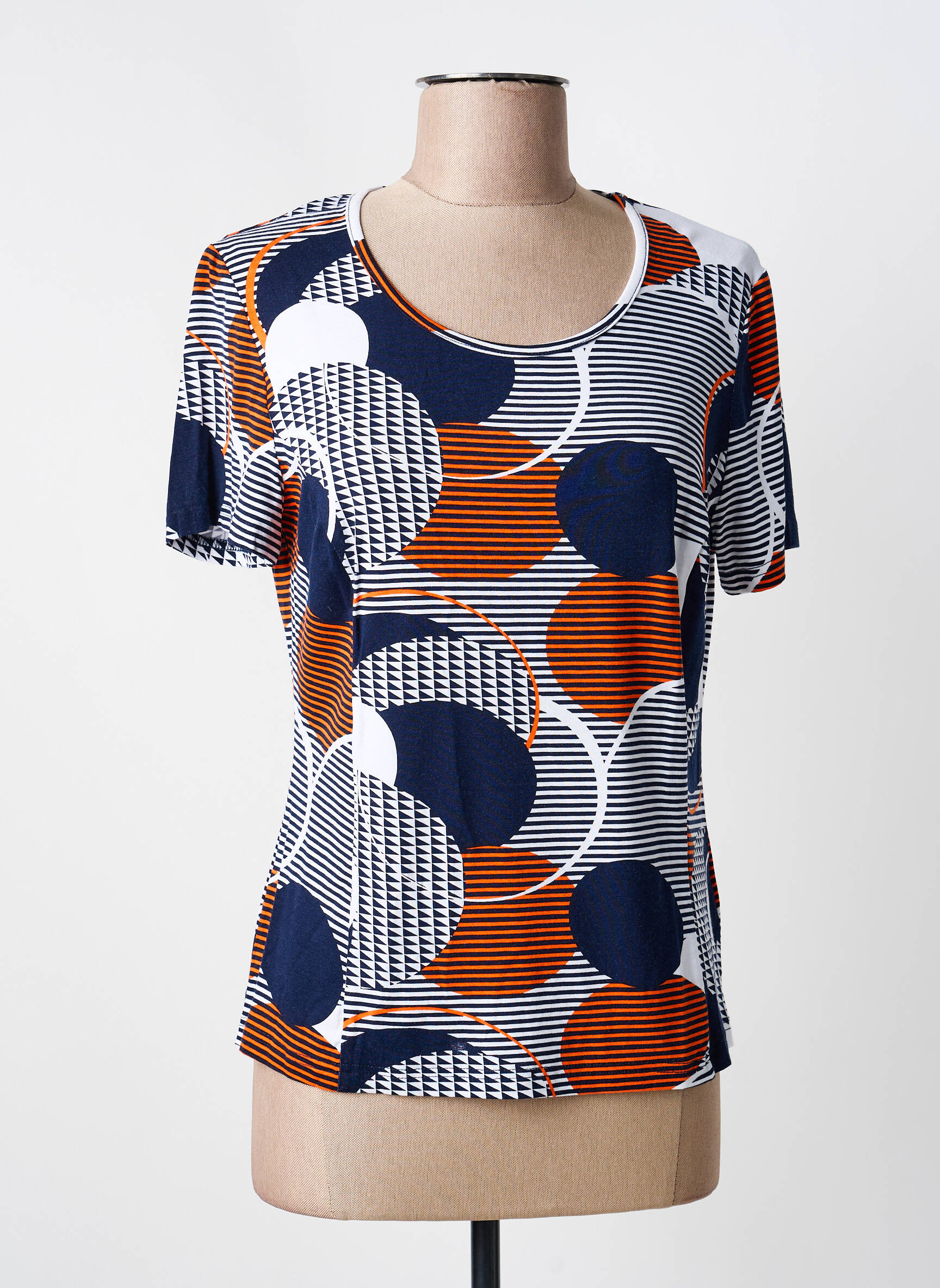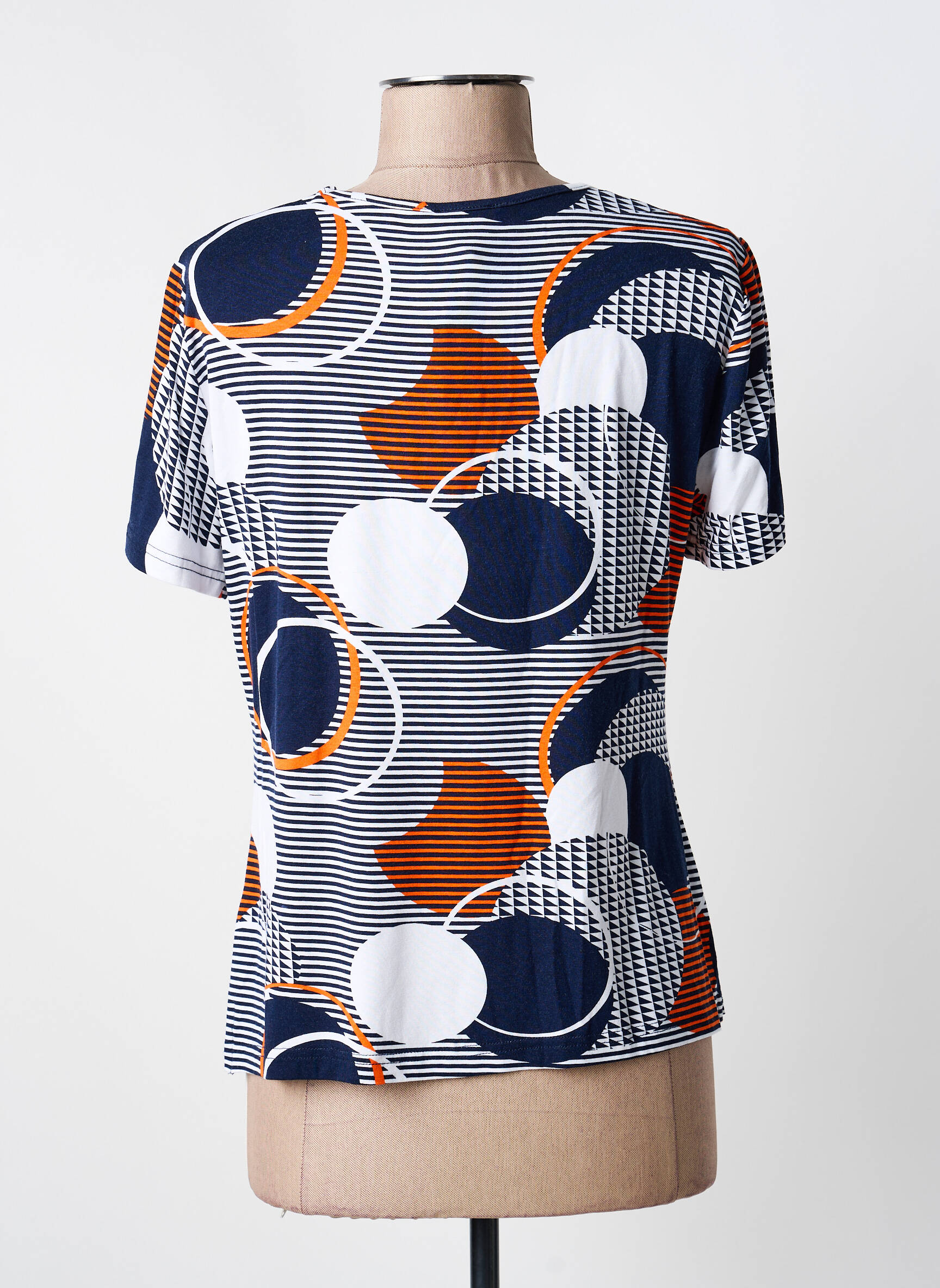 Profitez d’un vrai bon plan avec ce T-shirt GUY DUBOUIS pour femme, qui allie petit prix et style unique grâce à son motif graphique mêlant des cercles colorés et des rayures modernes dans des tons bleu marine, blanc et orange. Sa coupe classique et son col rond en font une pièce facile à porter au quotidien, idéale pour dynamiser votre garde-robe sans vous ruiner.
