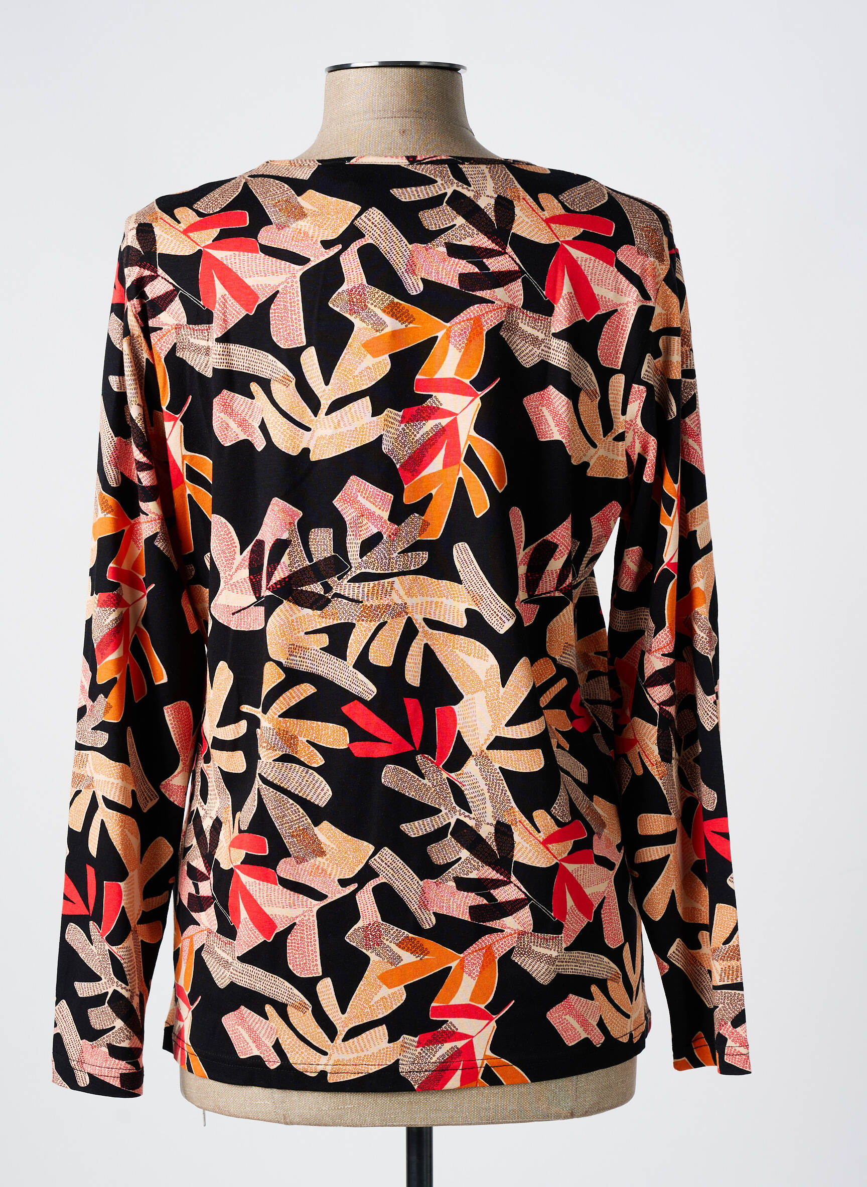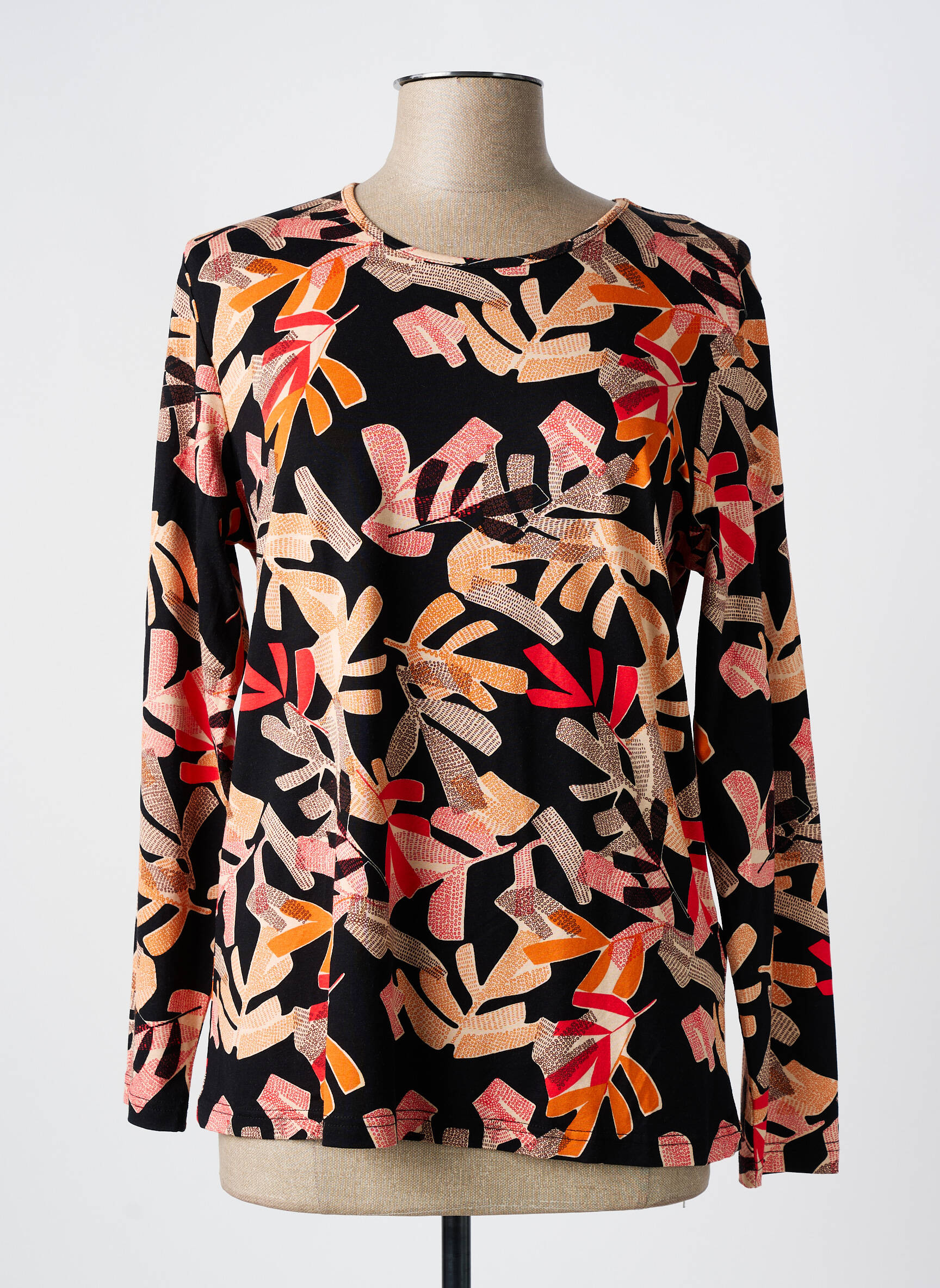 Imaginez porter un tableau d’automne qui s’anime au rythme de vos mouvements : ce T-shirt HAJO pour femme arbore un motif végétal abstrait aux teintes chaudes de rouge, orange, beige et rose sur un fond noir profond. Conçu avec des manches longues et une coupe ajustée, il offre une silhouette élégante tout en apportant une touche artistique et moderne à votre tenue.