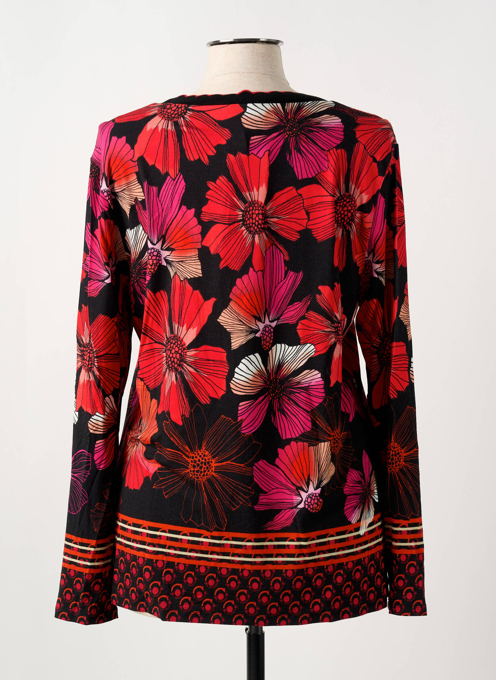 Craquez pour ce T-shirt HAJO pour femme à petit prix, une véritable opportunité pour ajouter une touche de peps à votre vestiaire sans exploser votre budget. Avec son imprimé floral éclatant dans les tons rouges, roses et orangés sur fond noir, ce modèle à manches longues séduit par son style dynamique et élégant. Le col rond subtilement souligné ajoute une touche de fantaisie, tandis que la bordure graphique rappelle les couleurs des fleurs pour un ensemble harmonieux. Adoptez un look tendance et original tout en faisant des économies avec ce basique revisité parfait pour la mi-saison.