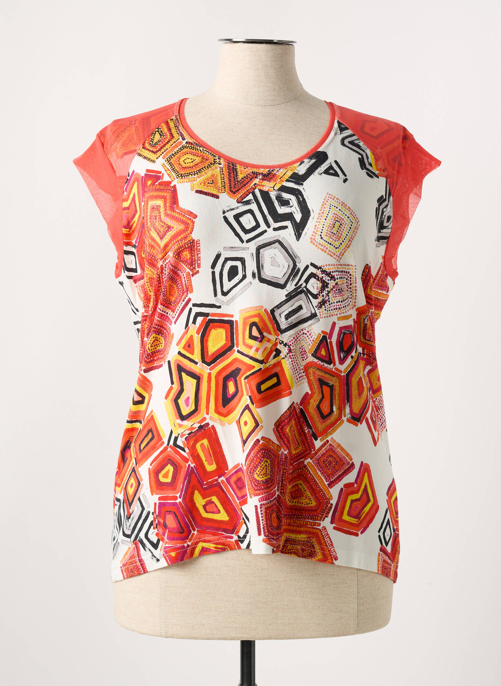 Craquez pour ce T-shirt femme signé I.ODENA, un véritable coup de cœur à prix mini pour celles qui aiment allier style original et économies. Avec son imprimé graphique éclatant aux tons orangés, rouges et noirs, souligné par des épaules en voile contrastant, il apportera une touche de peps à votre dressing tout en restant léger et agréable à porter. C’est l’occasion parfaite de renouveler votre look sans vous ruiner, grâce à ce bon plan mode issu de notre sélection déstockage multi-marques.