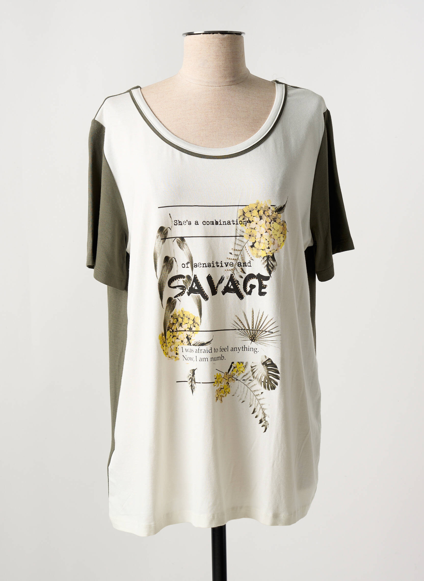 Ce T-shirt pour femme de la marque JAZZ est l’opportunité idéale de vous offrir une pièce tendance à petit prix. Avec son jeu de contrastes entre les manches olive et le corps crème, il affiche une coupe confortable rehaussée d’un imprimé sauvage orné de touches florales jaunes pour une allure moderne et originale. Profitez d’une belle économie tout en adoptant un style urbain et décontracté, parfait pour ajouter une note de fraîcheur à votre vestiaire sans vous ruiner.