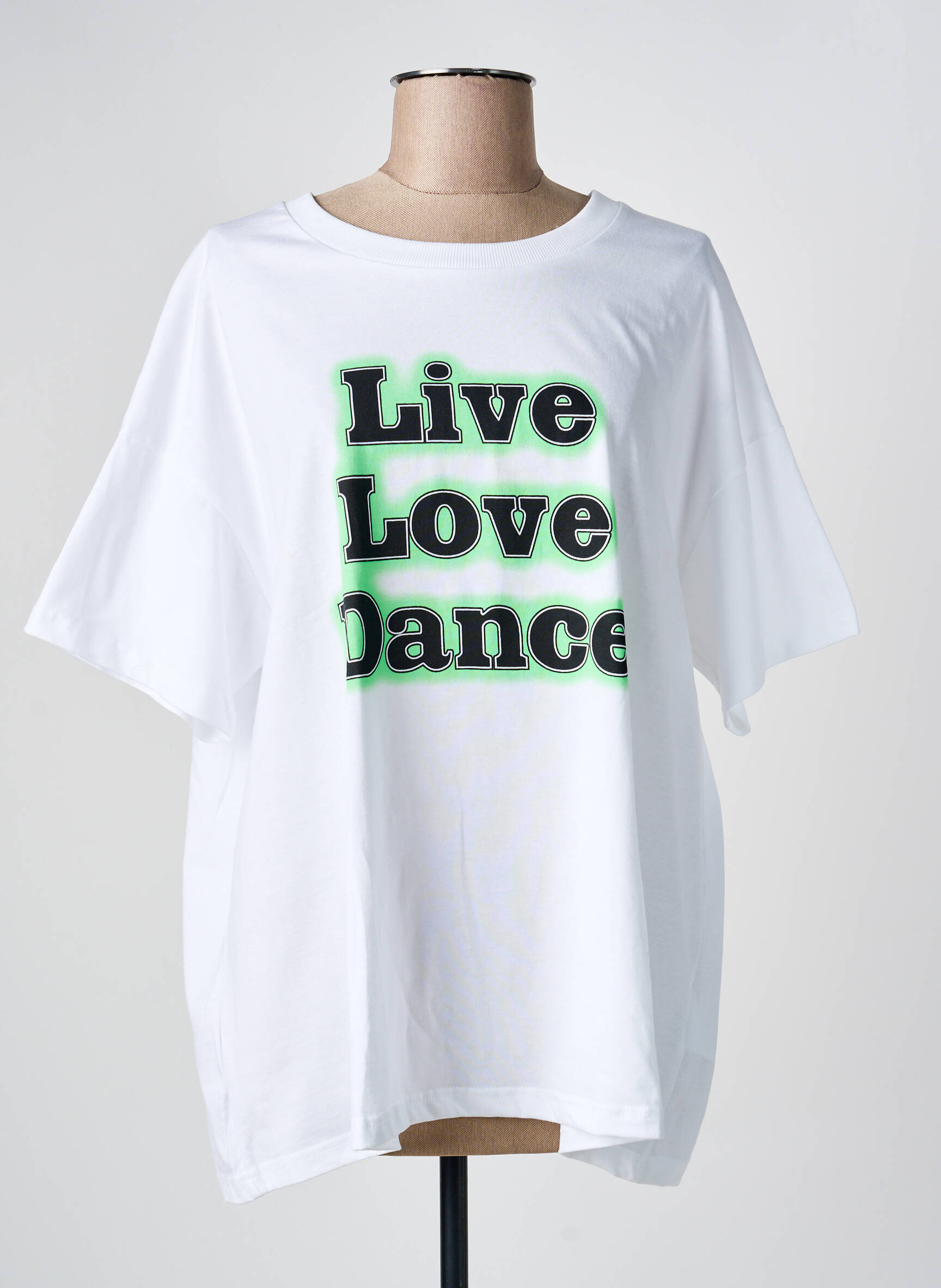Profitez d'une opportunité à petit prix avec ce T-shirt KAFFE pour femme, parfait pour ajouter une touche de style décontracté et tendance à votre garde-robe sans vous ruiner. Son imprimé "Live Love Dance" mis en valeur par un contour vert fluo apporte une note dynamique et moderne, tandis que la coupe ample assure un confort absolu pour toutes vos envies de mouvement. Adoptez sans attendre ce basique revisité, idéal pour un look urbain à prix malin.