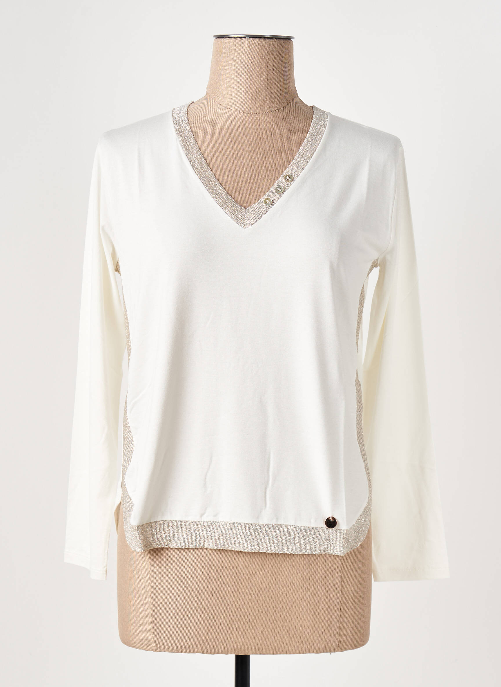 Craquez pour ce T-shirt femme LE BOUDOIR D'EDOUARD, une vraie affaire à petit prix pour renouveler votre dressing sans compromis sur le style. Sa coupe élégante à manches longues et son col V sont sublimés par une finition contrastante scintillante au niveau de l'encolure et de la base, apportant une touche chic discrète à toutes vos tenues. Ce modèle polyvalent est idéal pour composer des looks casual raffinés, tout en maîtrisant votre budget grâce à notre sélection déstockage multi-marque.
