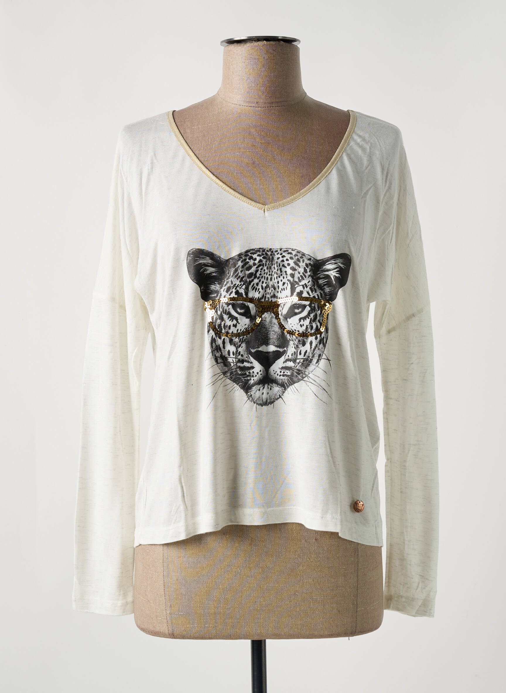 Ce T-shirt pour femme signé LE BOUDOIR D'EDOUARD est une véritable opportunité à petit prix pour affirmer son style sans se ruiner. Avec sa coupe décontractée, son col en V délicatement bordé et son imprimé tête de léopard plein de caractère, il apporte une touche sauvage et tendance à toutes vos tenues, parfait pour profiter d'une pièce originale à prix mini.