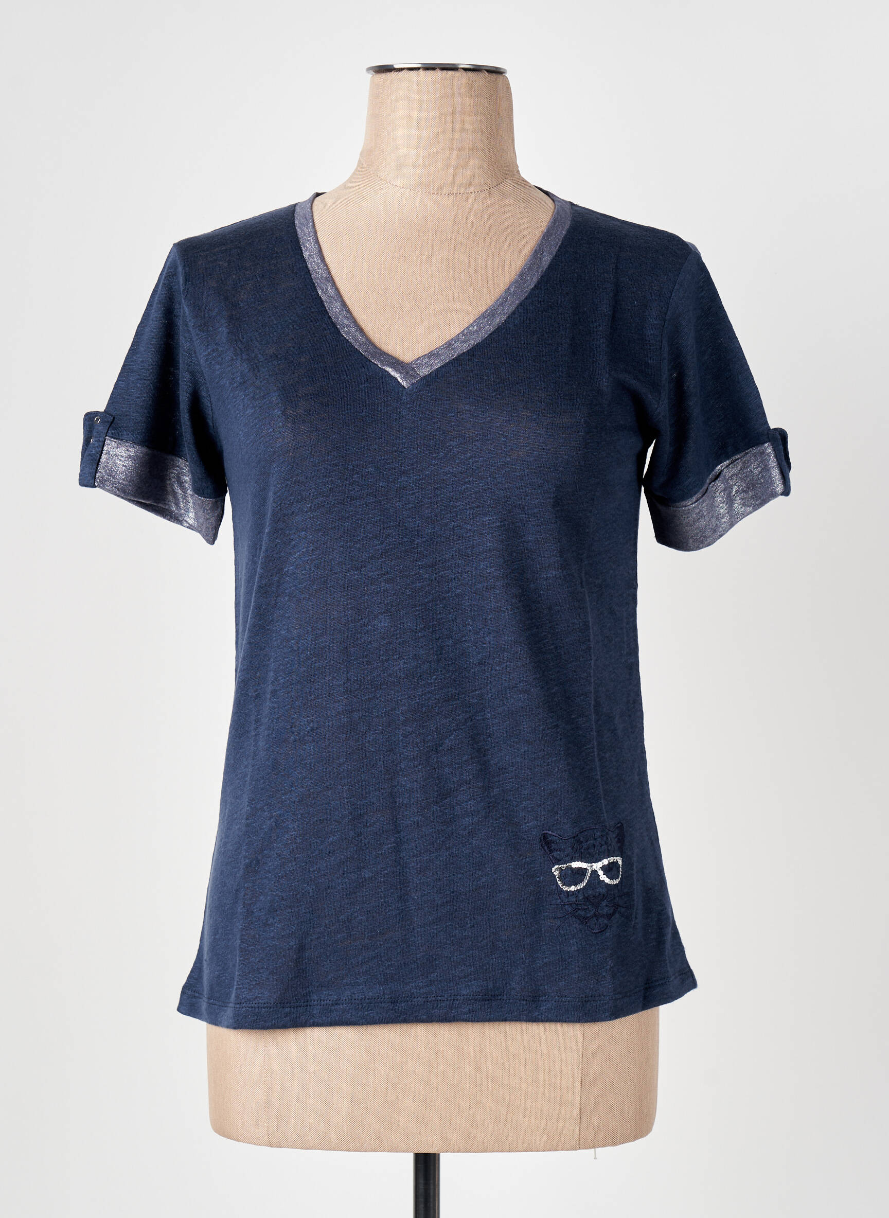 Profitez d’un excellent rapport qualité-prix avec ce T-shirt LE BOUDOIR D’EDOUARD pour femme, idéal pour ajouter une touche tendance à votre dressing sans vous ruiner. Sa coupe fluide et son col en V apportent une silhouette féminine, tandis que les finitions métallisées au col et aux manches offrent une note de sophistication casual. On craque pour le détail brodé d’une petite paire de lunettes près de la base qui souligne l’originalité du modèle, parfait pour composer un look chic à petit prix.