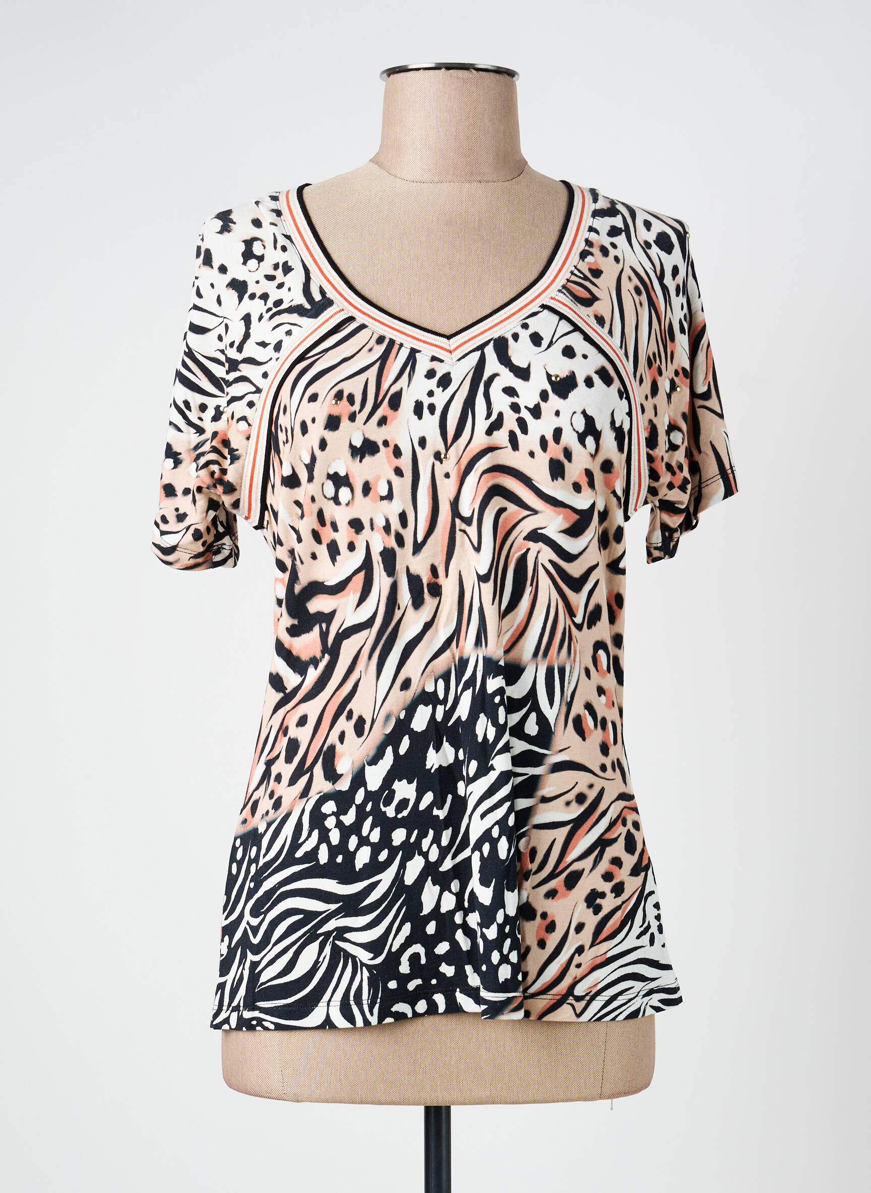 Offrez-vous un look tendance à petit prix avec ce T-shirt LESLIE pour femme, parfait pour celles qui veulent se démarquer sans se ruiner. Son imprimé animalier revisité mêle élégamment des touches de beige, noir et blanc, dynamisées par un col V graphique subtilement souligné de fines lignes colorées. Léger et facile à porter, ce modèle fluide apporte de la modernité à toutes vos tenues du quotidien, du bureau à la détente, pour un effet stylé sans effort et sans exploser votre budget.