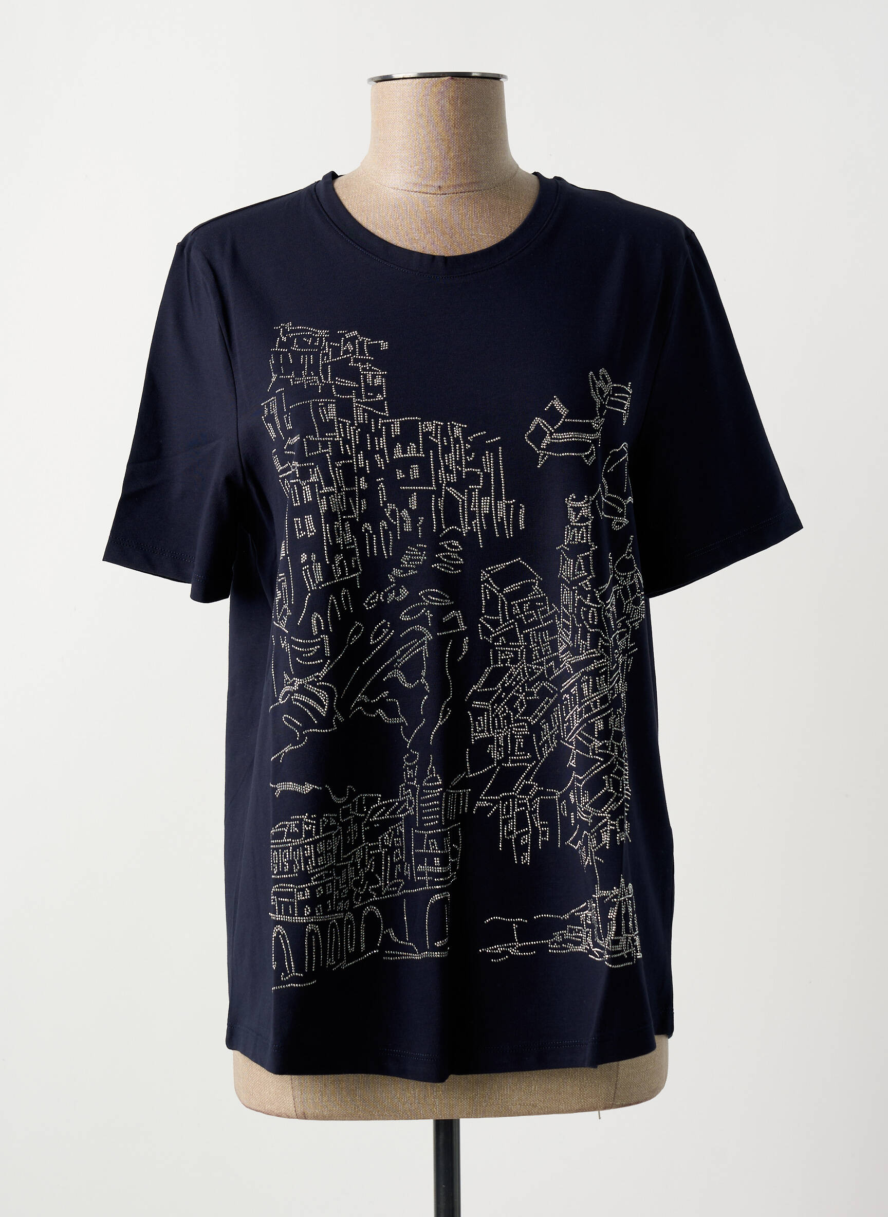 Profitez d’une occasion exceptionnelle avec ce T-shirt MARIA BELLENTANI pour femme, proposé à prix tout doux pour styliser votre garde-robe sans vous ruiner. Son coloris bleu marine intemporel est rehaussé d’un motif graphique représentant une ville dessinée, apportant une touche artistique et moderne à votre look. Facile à porter au quotidien, il vous permet d’affirmer votre personnalité avec élégance tout en réalisant de vraies économies.