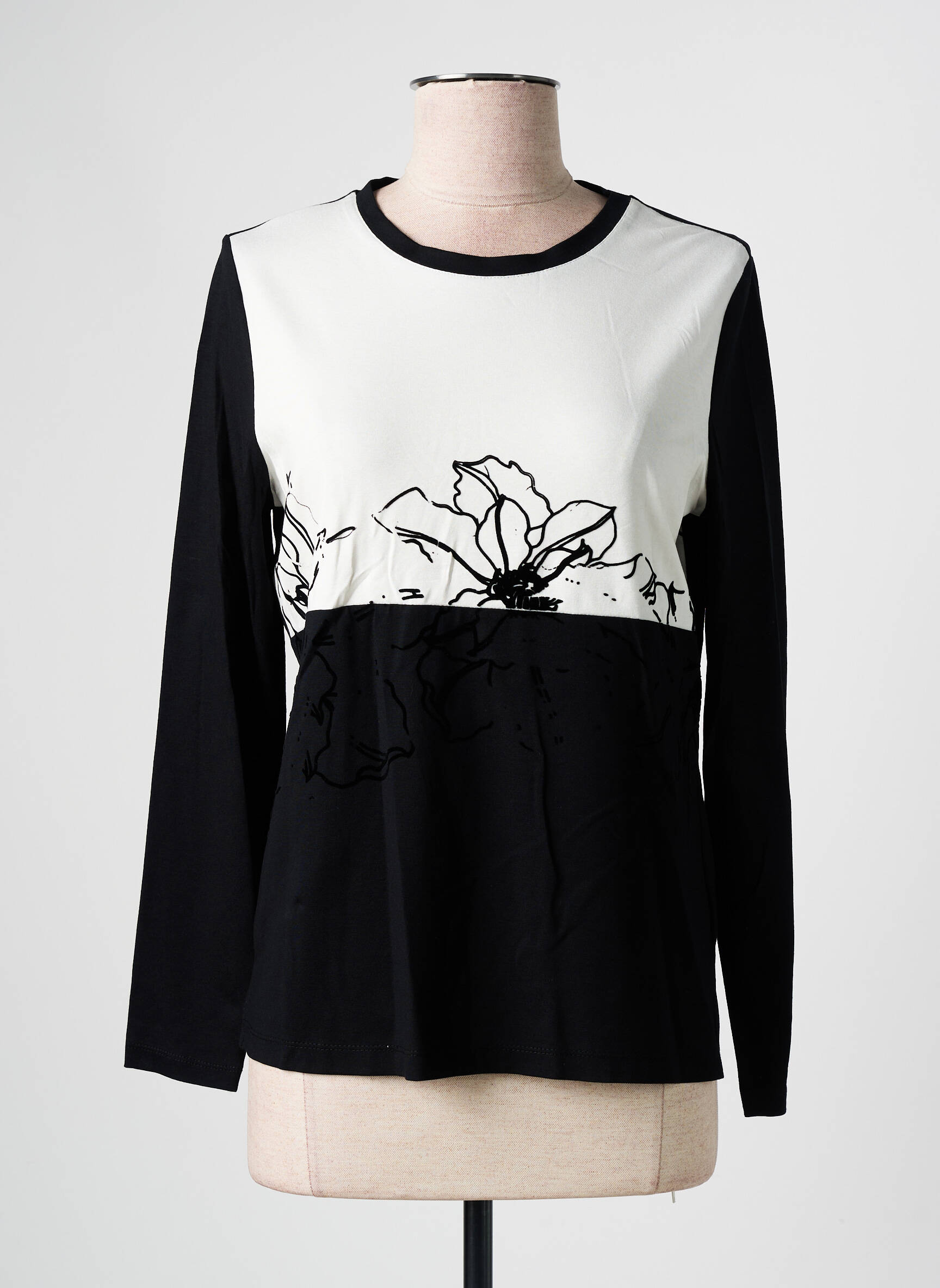 Craquez pour ce T-shirt femme de la marque MERI & ESCA à prix tout doux, idéal pour se faire plaisir sans se ruiner. Son design moderne joue sur un contraste élégant entre le noir et le blanc, rehaussé par un motif floral graphique qui apporte une touche de féminité raffinée. Les manches longues et la coupe confortable en font un allié parfait pour un look casual chic en toute saison, tout en profitant d'une belle opportunité shopping à petit prix.