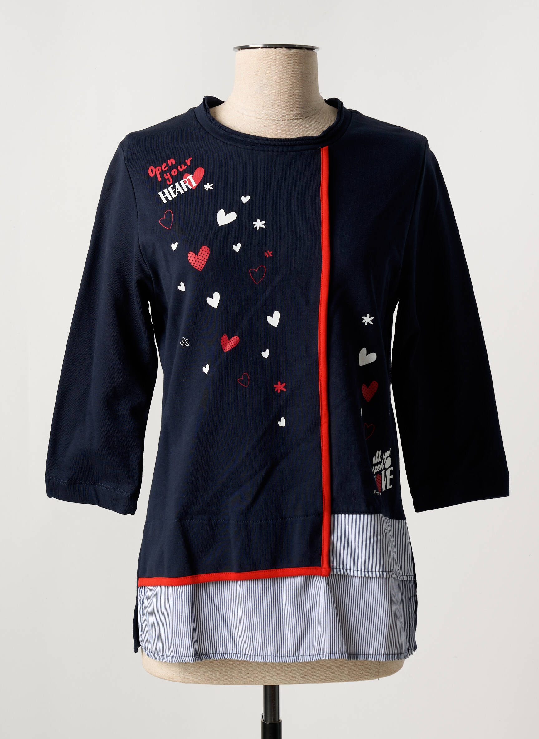Craquez pour ce T-shirt femme de la marque MISS SIDECAR à prix malin, parfait pour ajouter une touche originale à votre dressing sans vous ruiner. Sa coupe féminine et son design créatif jouent avec les contrastes entre le bleu marine uni et une base effet chemise à rayures, relevés par une ligne rouge énergique en rappel des motifs cœurs et messages sur le devant. Les manches trois-quarts apportent une touche moderne et décontractée, idéale pour un look casual tendance à petit prix.
