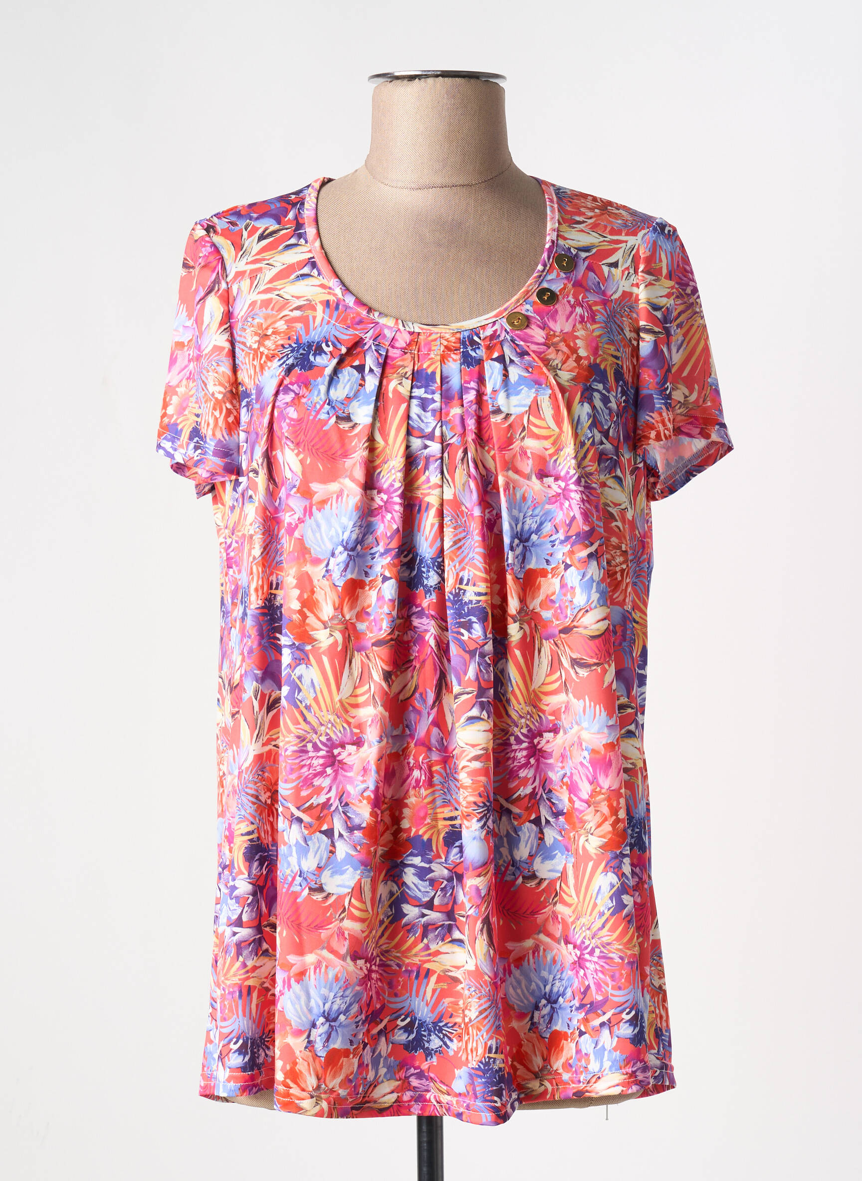 Craquez pour ce T-shirt femme de la marque MULTIPLES à prix mini, parfait pour apporter une touche de couleur à votre garde-robe sans vous ruiner. Son imprimé floral éclatant mélange subtilement les tons orangés, fuchsia et violets pour un rendu vitaminé, tandis que sa coupe fluide et ses détails de plis au col garantissent confort et féminité au quotidien. Profitez de cette affaire pour adopter un style plein de fraîcheur à petit prix.
