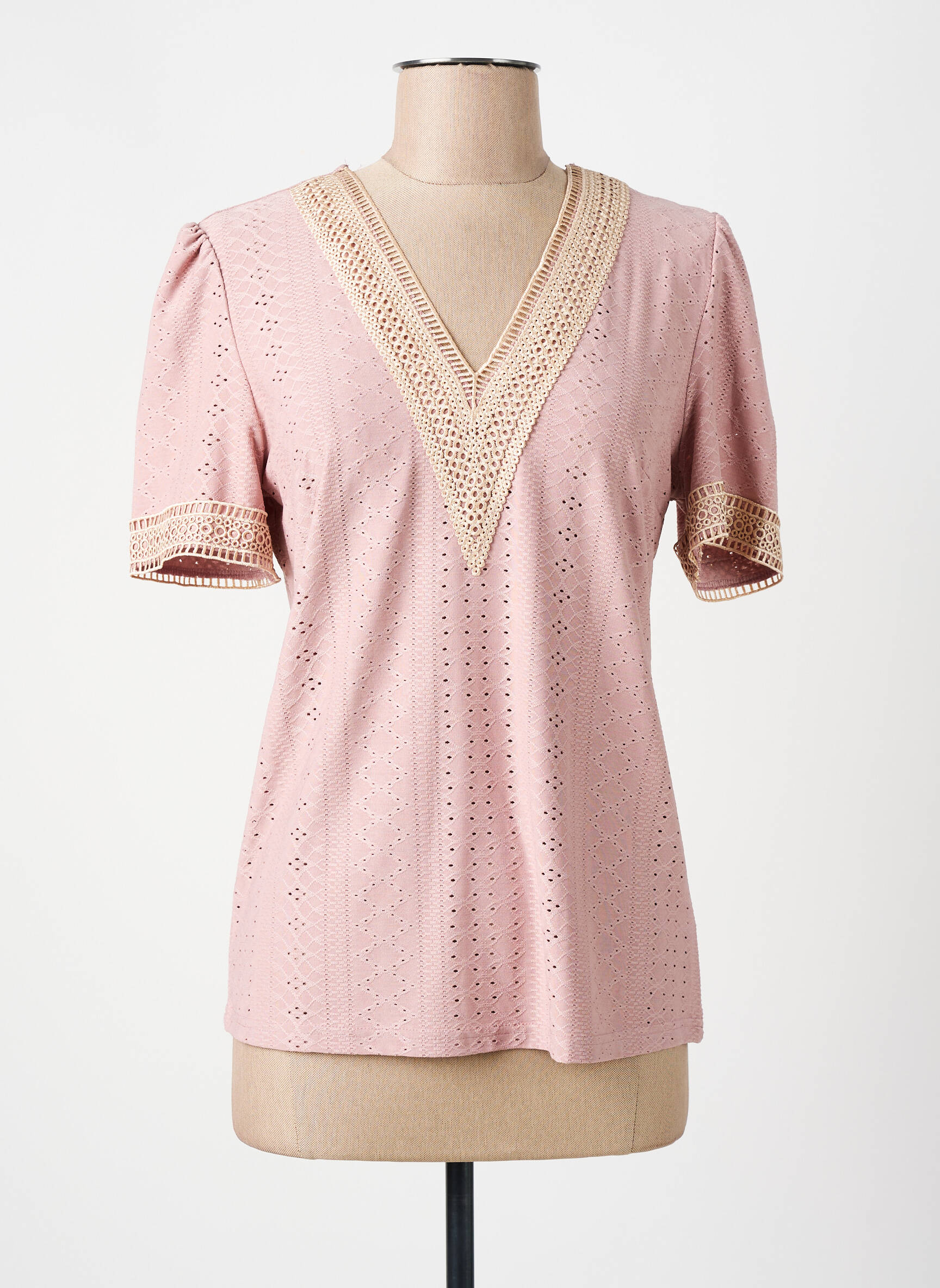 Craquez pour ce T-shirt NARA pour femme, un vrai bon plan pour ajouter une touche d'élégance à petit prix à votre garde-robe. Son délicat coloris rose poudré est sublimé par de fines broderies ajourées et un joli col en V bordé de dentelle écrue, pour une allure à la fois romantique et moderne. Les manches courtes se terminent également par une finition en dentelle qui apporte une note raffinée, idéale pour sublimer vos tenues du quotidien sans vous ruiner.