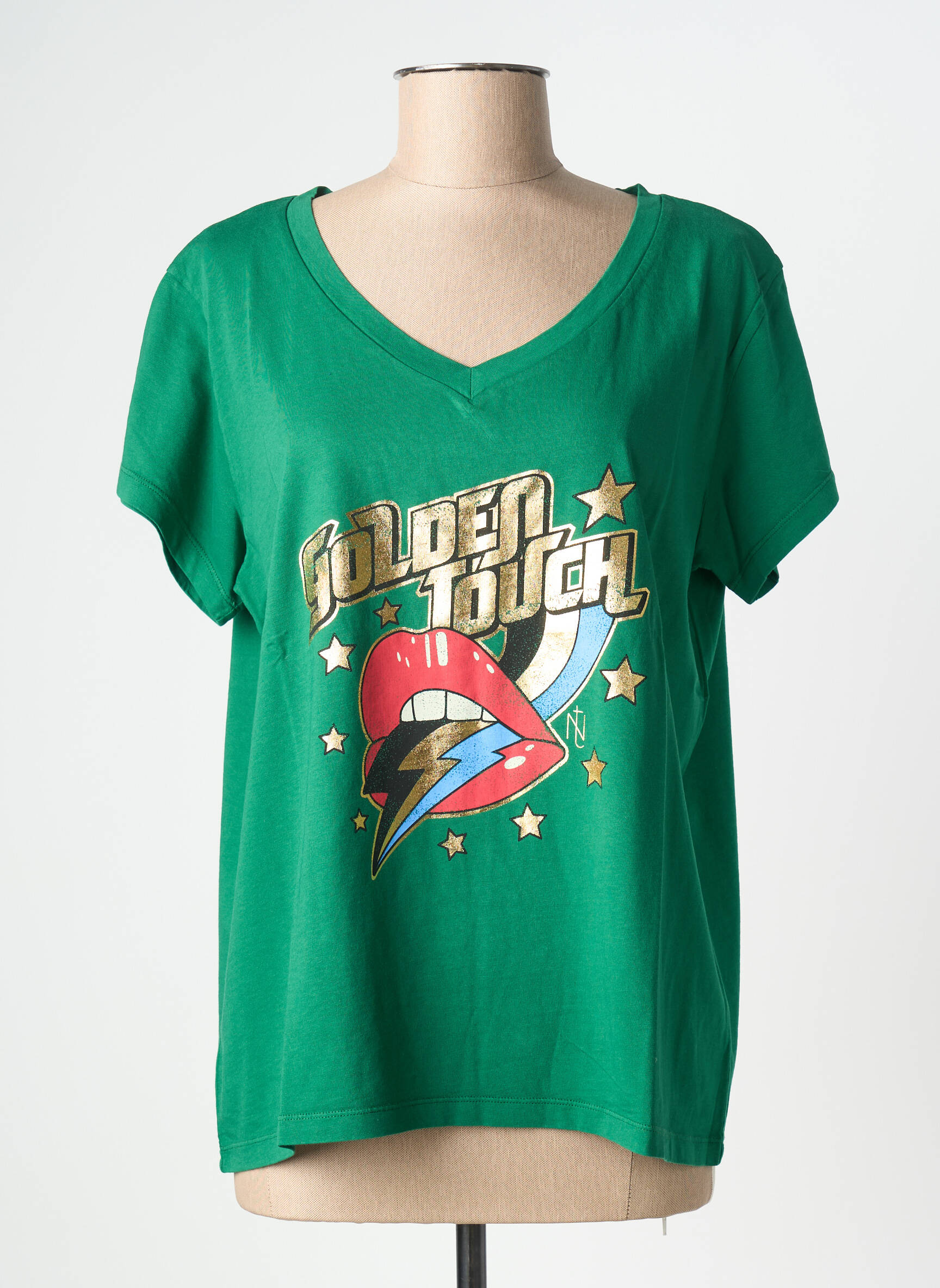 Profitez d’un super bon plan mode avec ce T-shirt pour femme NINE TEES à prix mini, parfait pour une touche tendance sans se ruiner. Sa couleur verte dynamique s’accompagne d’un imprimé pop et vintage affichant “Golden Touch” avec des motifs étoiles et éclairs, pour un look fun et original. Son col en V et sa coupe fluide en font un basique confortable et stylé à ajouter sans hésitation à votre dressing.