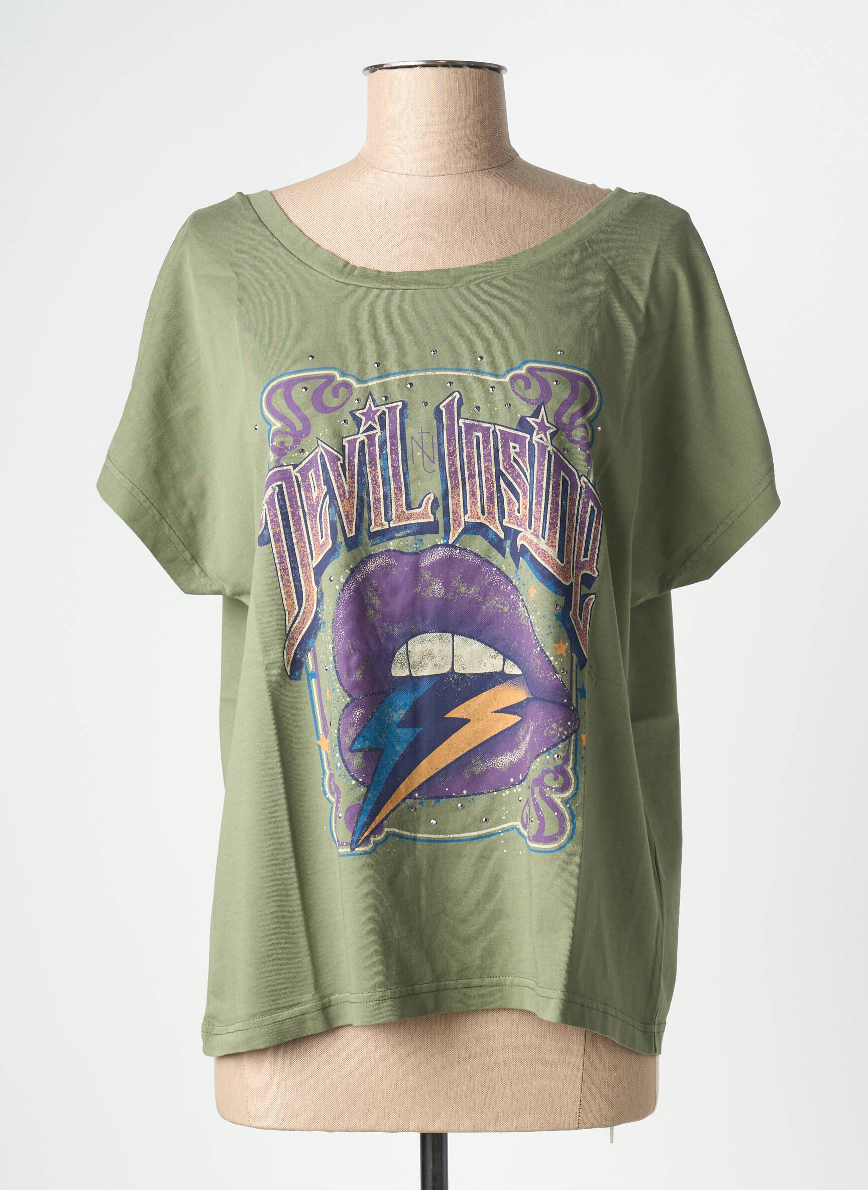 Profitez d’un look tendance à petit prix avec ce T-shirt pour femme signé NINE TEES. Sa couleur kaki subtile s’associe à un imprimé original mêlant bouche pop et éclair, pour une touche rebelle et graphique ultra-moderne. Grâce à sa coupe ample et son col légèrement évasé, il apporte un confort idéal au quotidien tout en affichant un style affirmé sans vous ruiner. C’est le bon plan parfait pour rafraîchir votre garde-robe sans exploser votre budget.