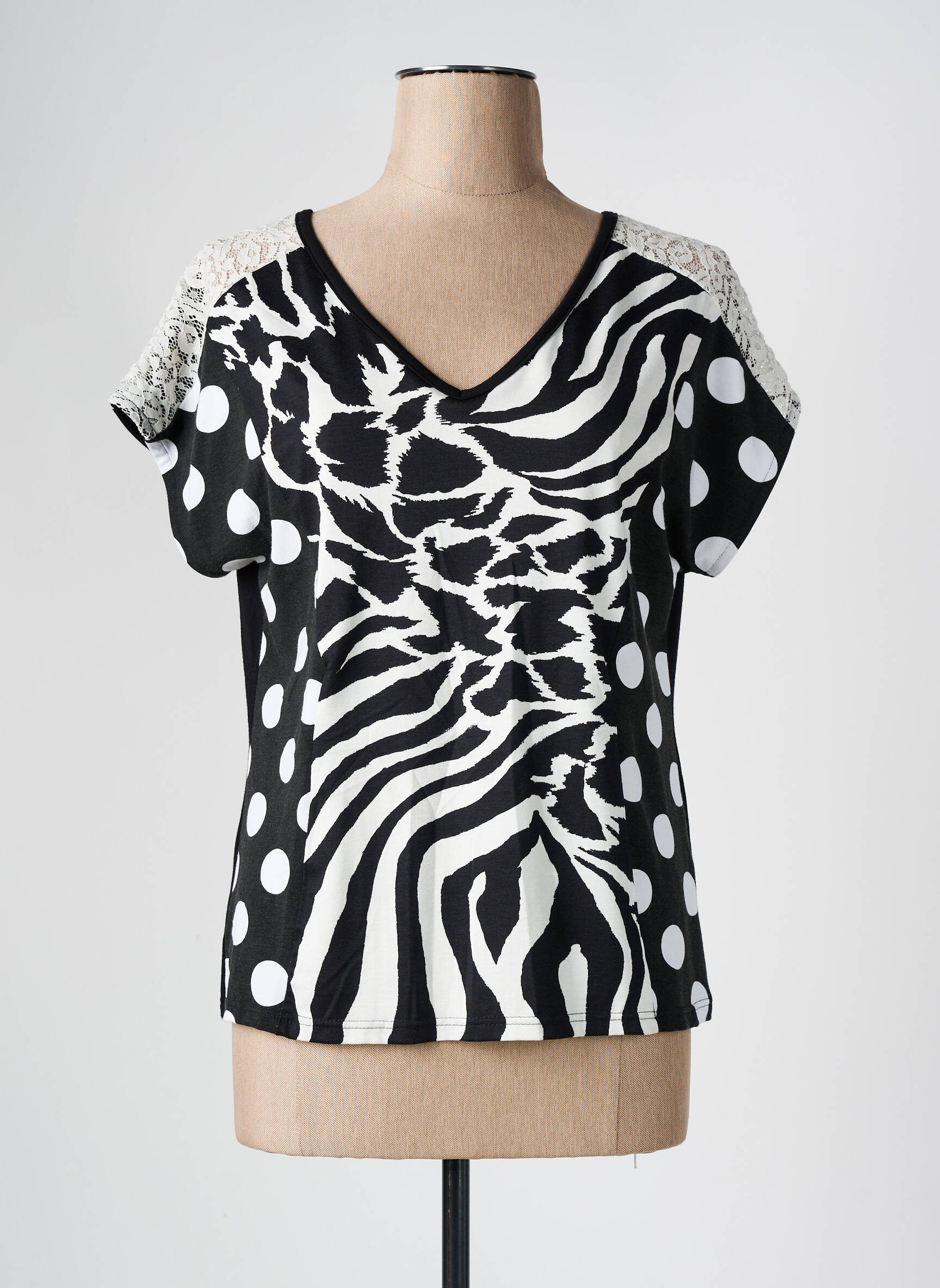 Profitez d'une occasion à ne pas manquer avec ce T-shirt femme OLIVIER PHILIPS, une pièce originale à prix tout doux qui séduira toutes les amatrices de looks uniques. Ce modèle se distingue par son audacieux mélange d’imprimé zèbre et de pois noirs et blancs, souligné par une encolure en V flatteuse et de délicats empiècements de dentelle sur les épaules, parfait pour dynamiser votre garde-robe sans vous ruiner.