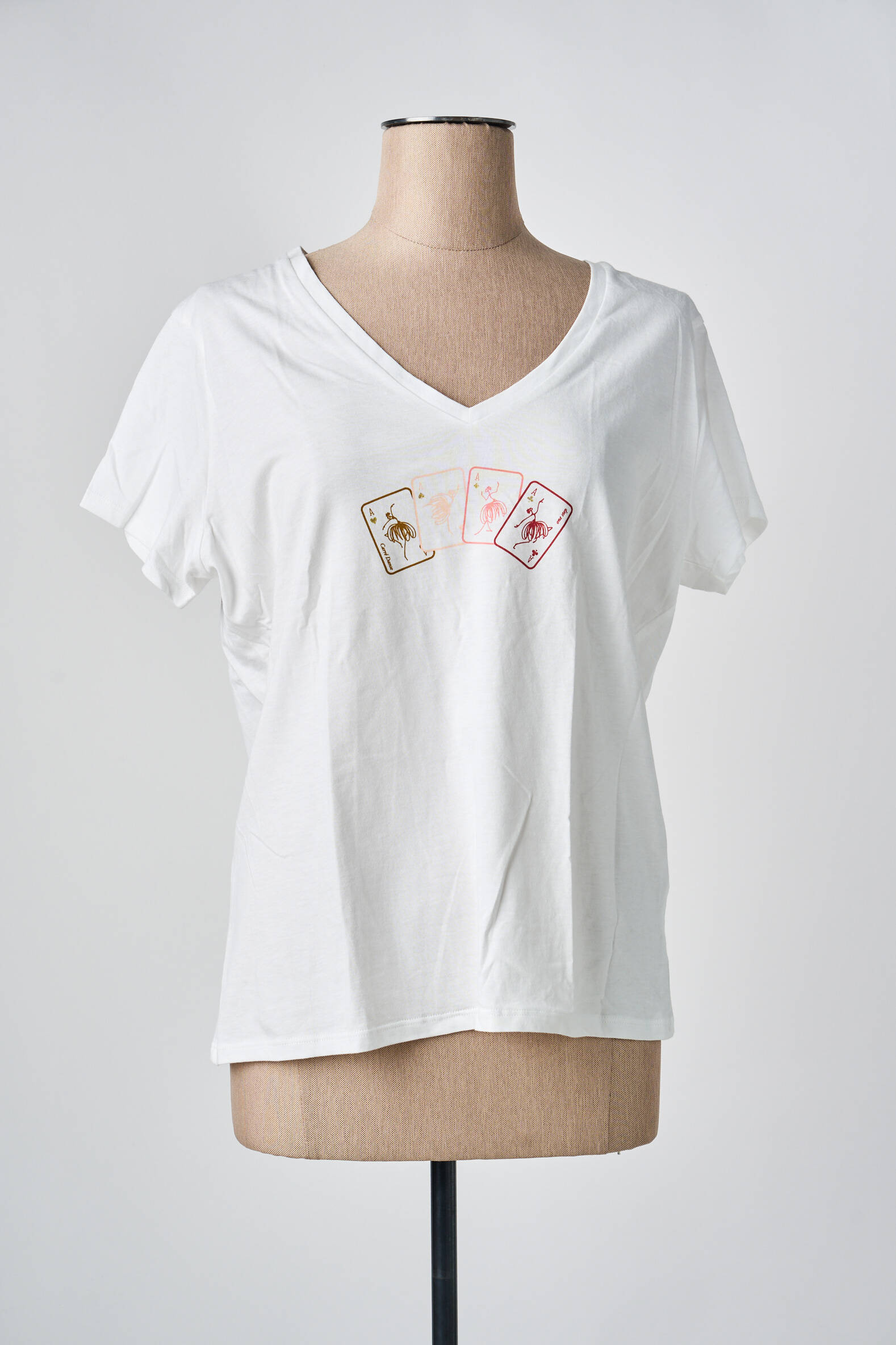 Profitez d’un bon plan irrésistible avec ce T-shirt pour femme de la marque ONE STEP, idéal pour apporter une touche tendance à petit prix. Ce haut blanc met en valeur un col en V élégant et un imprimé orignal de cartes à jouer sur la poitrine, parfait pour donner du caractère à vos tenues du quotidien sans vous ruiner. Saisissez l’opportunité de vous offrir une pièce de qualité à prix doux !