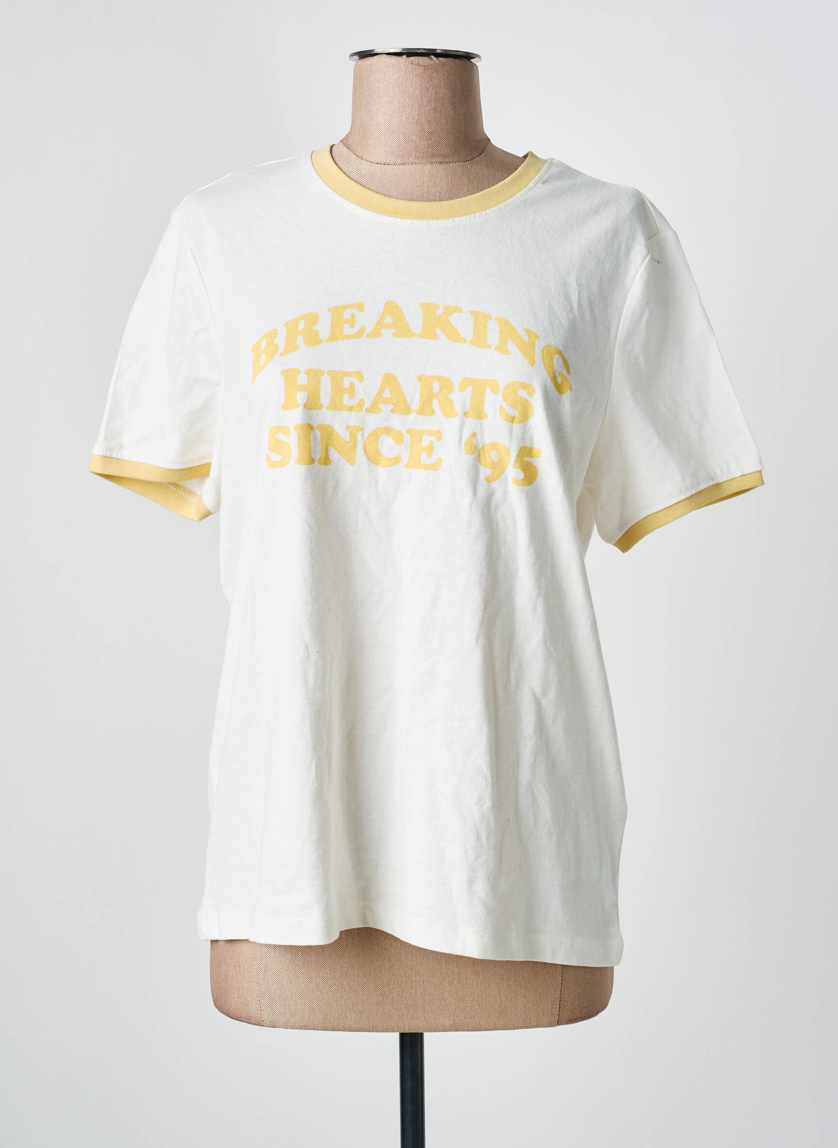 Craquez pour ce T-shirt ONLY pour femme, une pièce tendance à petit prix qui vous permet d’adopter un look rétro sans vous ruiner, avec son message "Breaking Hearts Since '95" imprimé en jaune et ses finitions contrastantes au col et aux manches qui offrent une touche originale et dynamique à votre tenue quotidienne.