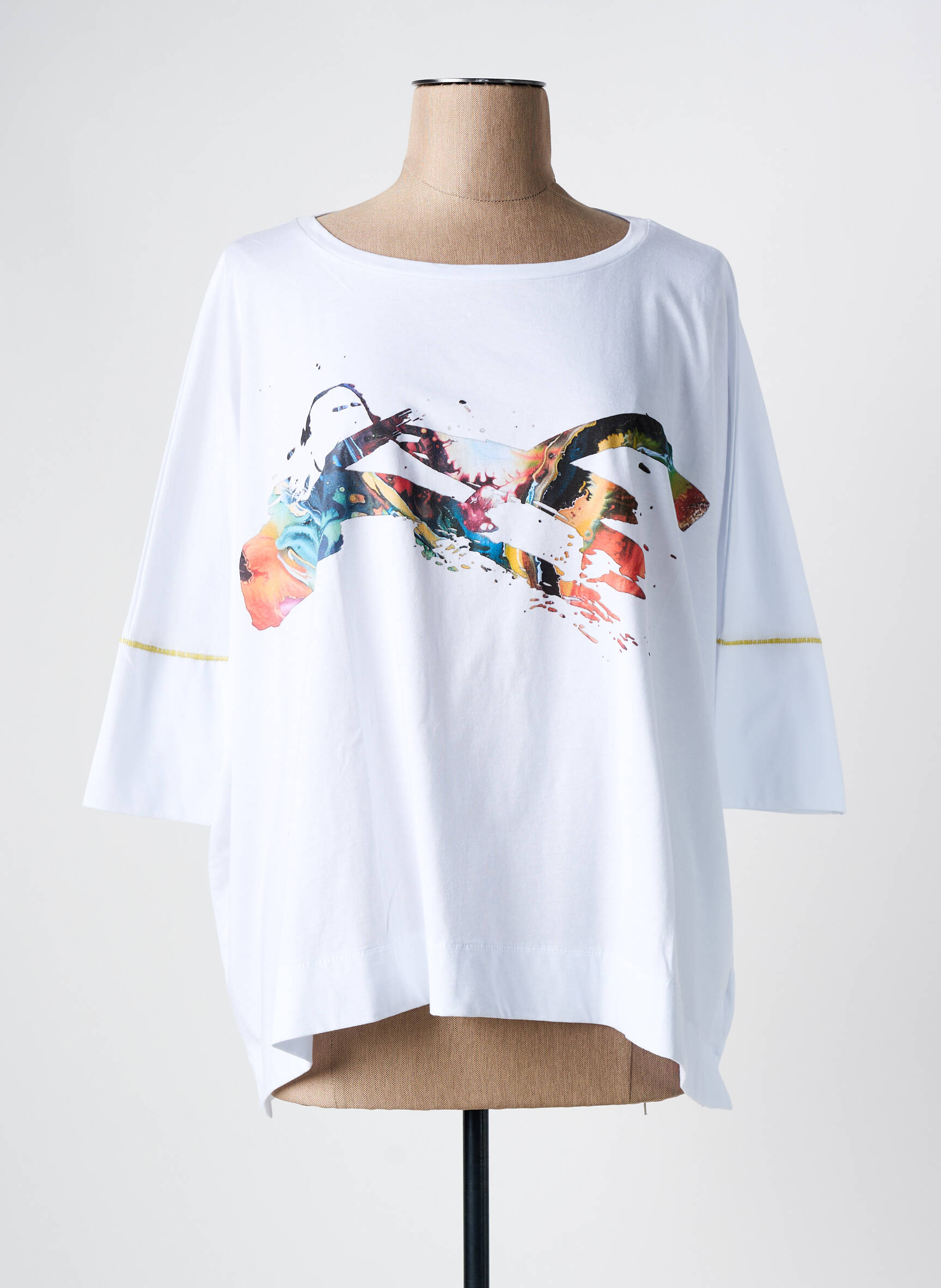 Craquez pour ce T-shirt femme OZAI N KU proposé à prix réduit, l’occasion idéale d’ajouter une pièce originale à votre dressing sans vous ruiner. Sa coupe ample et confortable est sublimée par un imprimé artistique haut en couleur sur le devant, tandis que de subtils détails jaunes sur les manches ajoutent une touche moderne et dynamique. Voilà un achat malin pour un look tendance tout en maîtrisant son budget.