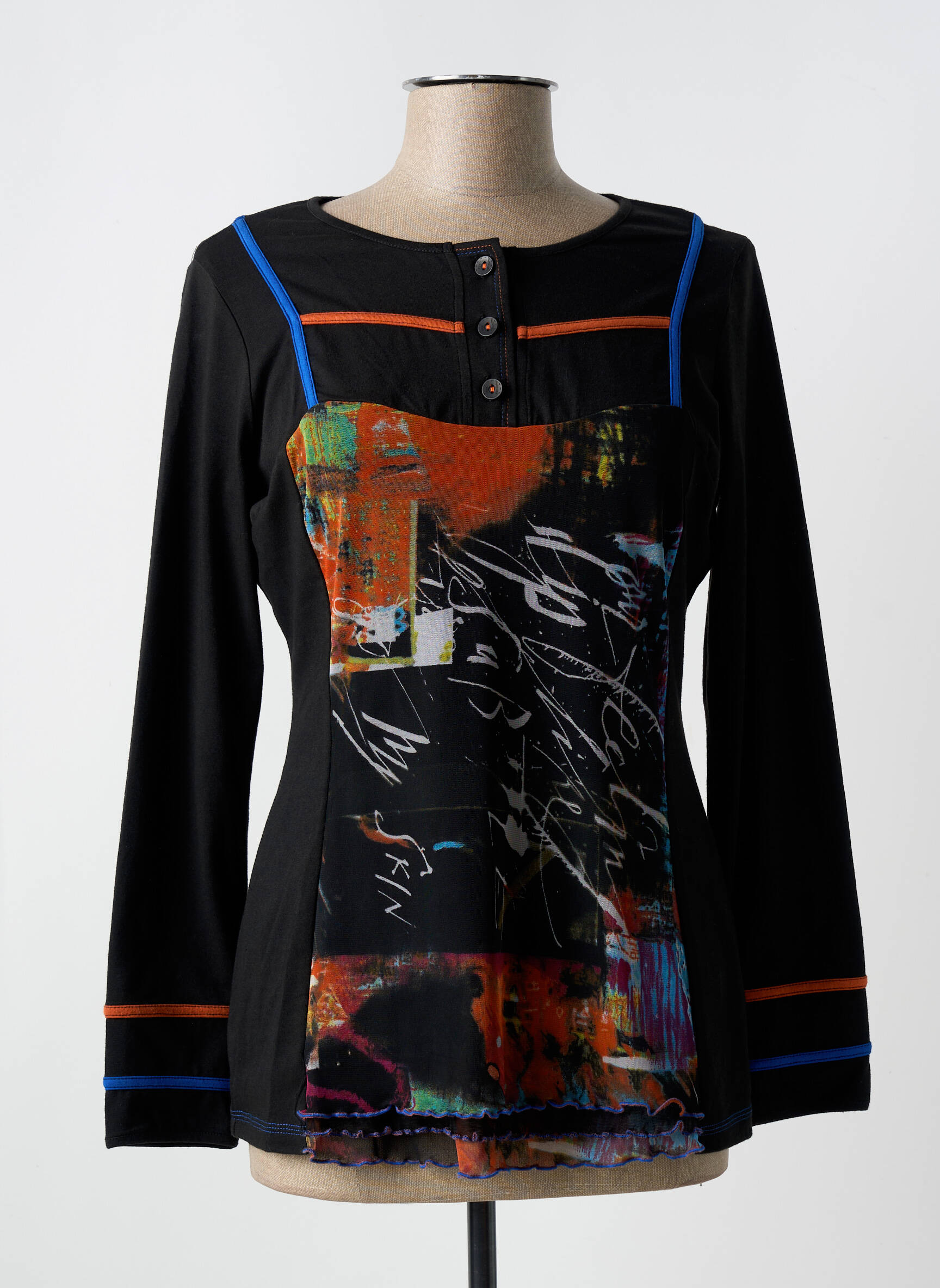 Saisissez la bonne affaire avec ce T-shirt femme de la marque QUATRE VINGT JOURS, un haut original à prix doux qui ne passera pas inaperçu avec son imprimé graphique multicolore et sa coupe moderne. Son jeu de contrastes, relevé par des bandes colorées sur les manches et l’encolure ainsi que ses boutons décoratifs à l’avant, apporte une touche tendance idéale pour dynamiser vos looks du quotidien, le tout sans vous ruiner.