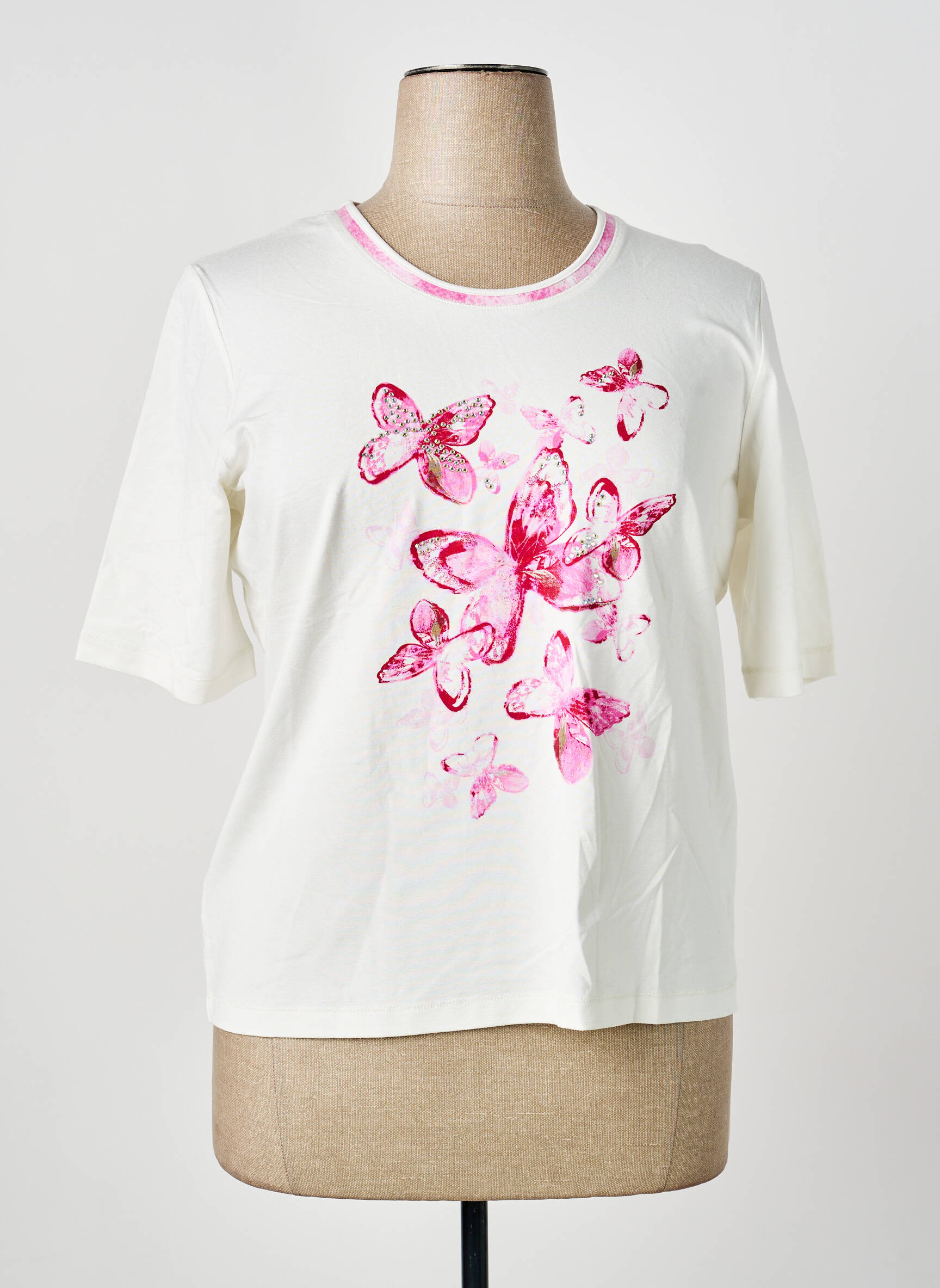 Profitez d’un bon plan mode avec ce T-shirt RABE pour femme, une pièce idéale pour apporter une touche printanière à votre garde-robe sans vous ruiner grâce à son prix tout doux. Son imprimé délicat de papillons dans des tons roses illumine un fond blanc cassé, tandis que la coupe droite et les manches courtes vous assurent un confort parfait au quotidien. Ce T-shirt allie style et économies, le compromis parfait pour celles qui aiment la qualité à petit prix.