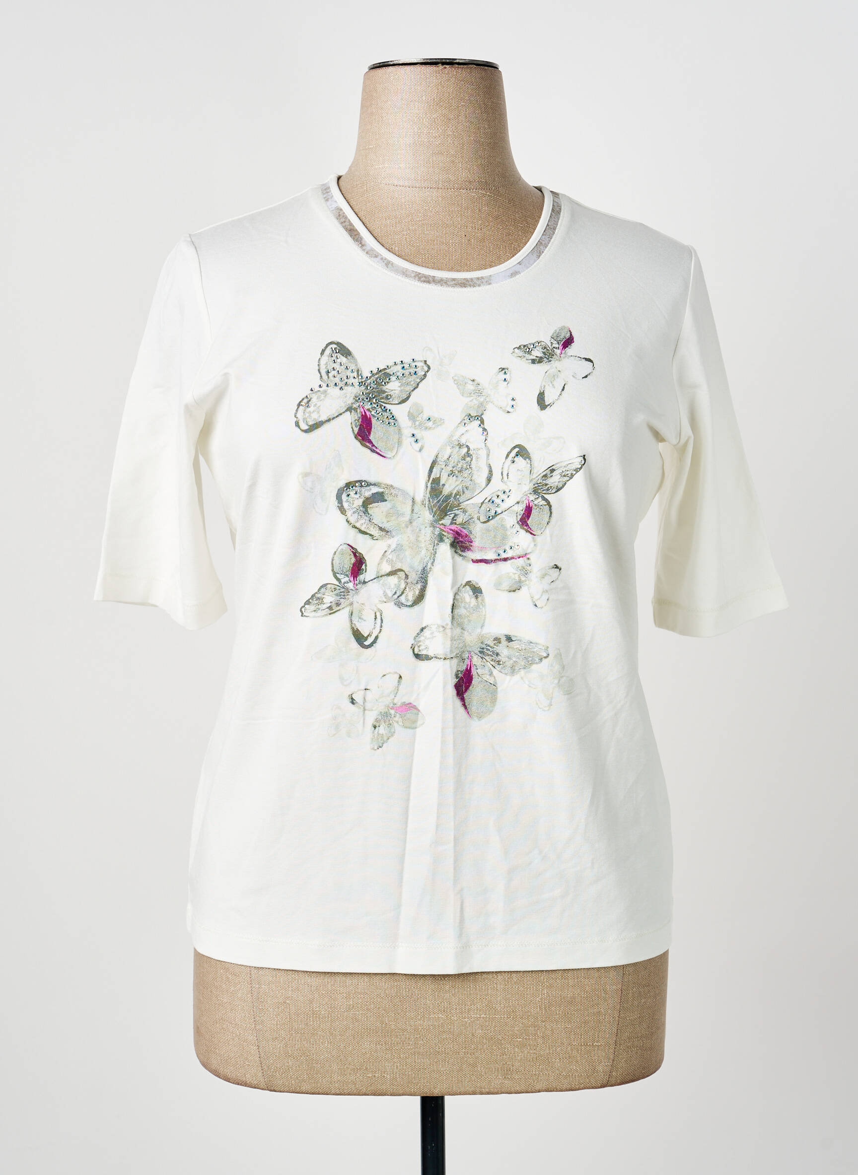 Profitez d’un bon plan mode avec ce T-shirt RABE pour femme, proposé à prix mini?! Avec son fond blanc lumineux rehaussé de papillons délicatement imprimés et ses touches subtiles de couleur, il apporte une note fraîche et originale à votre tenue. Son encolure arrondie et ses manches légèrement allongées offrent une coupe moderne et facile à porter au quotidien. Voilà une pièce coup de cœur idéale pour enrichir votre dressing sans vous ruiner.