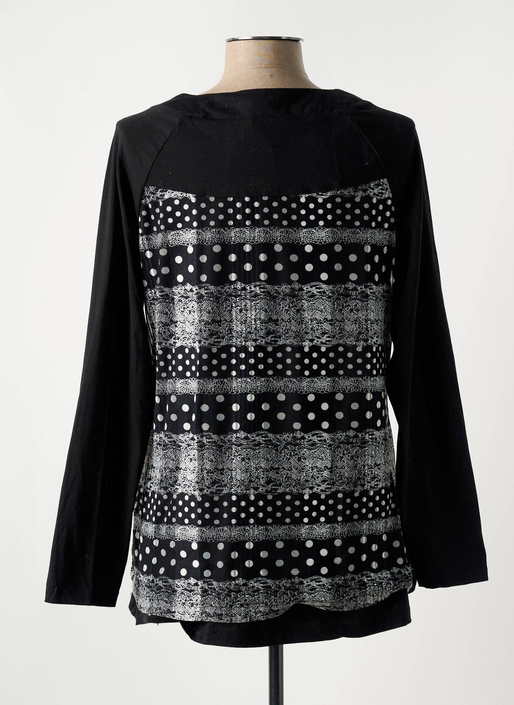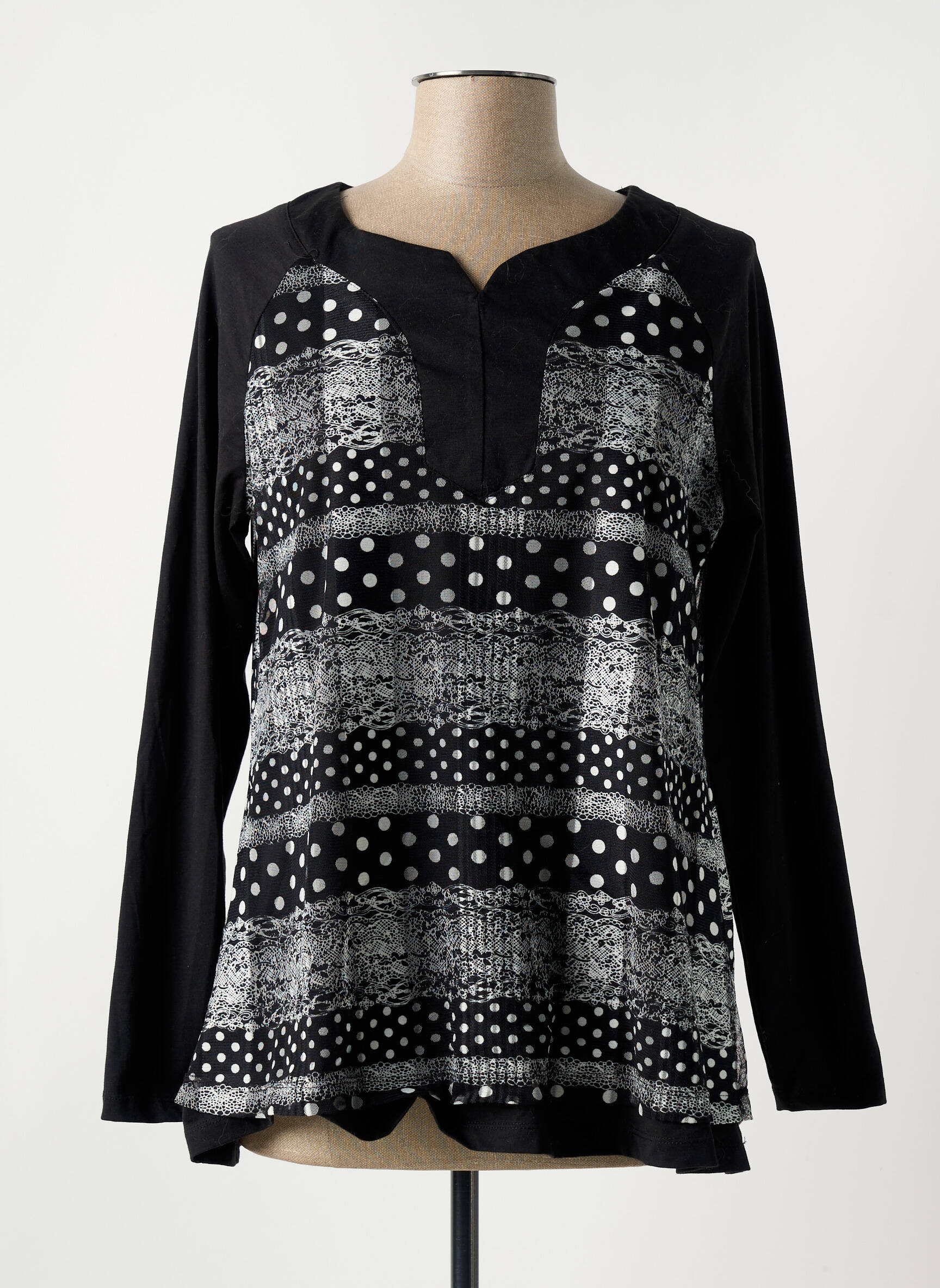 Profitez d’un T-shirt féminin à prix mini signé S.QUISE, parfait pour dynamiser vos looks quotidiens sans vous ruiner. Son jeu de motifs graphiques mêlant pois et effets texturés en noir et blanc, associé à ses manches longues et son joli col ouvert, lui donne une touche moderne facile à porter avec un jean ou une jupe pour un style original et branché à petit prix.