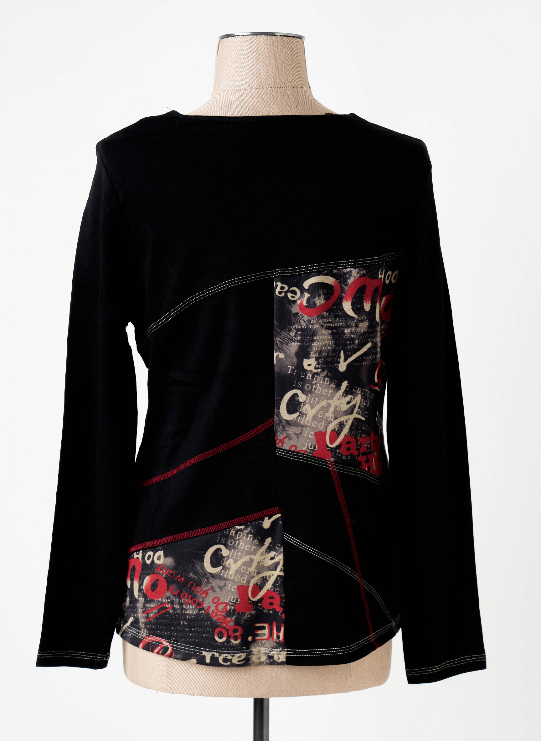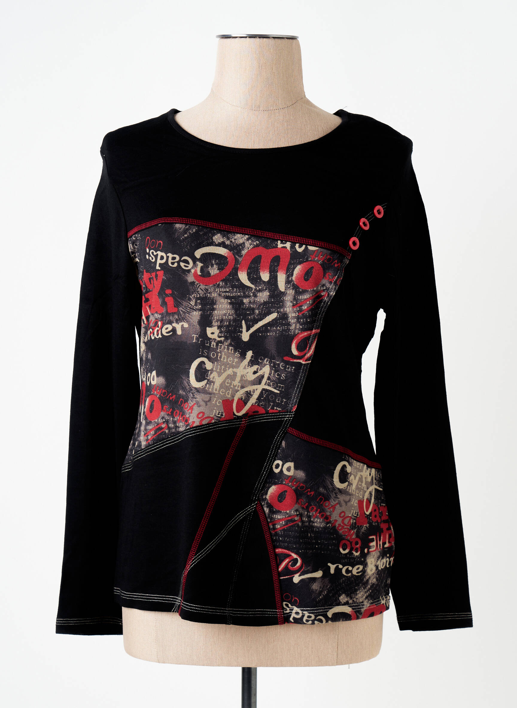 Craquez pour ce T-shirt femme S.QUISE à petit prix, parfait pour ajouter une touche originale à votre garde-robe sans vous ruiner. Son design unique allie des empiècements graphiques aux motifs imprimés et des jeux de couleurs noir, rouge et beige qui attirent l'œil, tandis que les détails sur l’épaule et le bas du vêtement apportent une note moderne. Profitez d’un look tendance et affirmé tout en faisant des économies grâce à ce bon plan mode multi-marques.