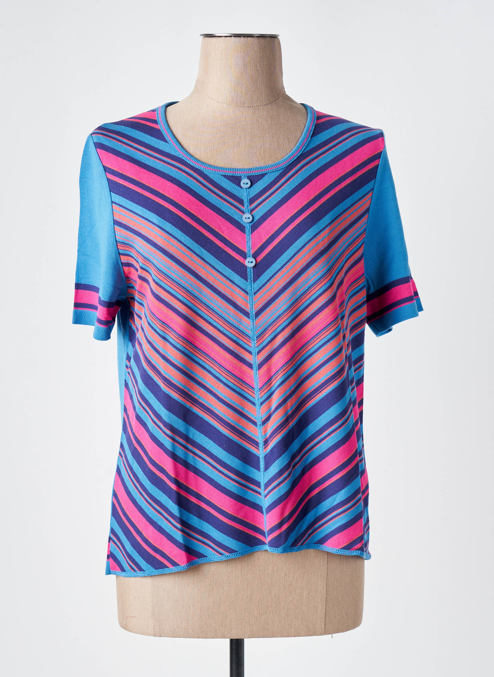 Craquez pour ce superbe T-shirt SAINT CHARLES pour femme, une pièce tendance à petit prix qui illuminera votre garde-robe sans faire mal à votre porte-monnaie. Sa coupe confortable s’associe parfaitement à un motif graphique de rayures multicolores, souligné par des tons éclatants de bleu, de rose et de violet. Le devant est rehaussé de petits boutons qui apportent une touche d’originalité à ce modèle à encolure ronde. Profitez de ce bon plan pour offrir à votre look une note dynamique et colorée, idéale pour toutes vos envies de style sans compromis sur l’économie.