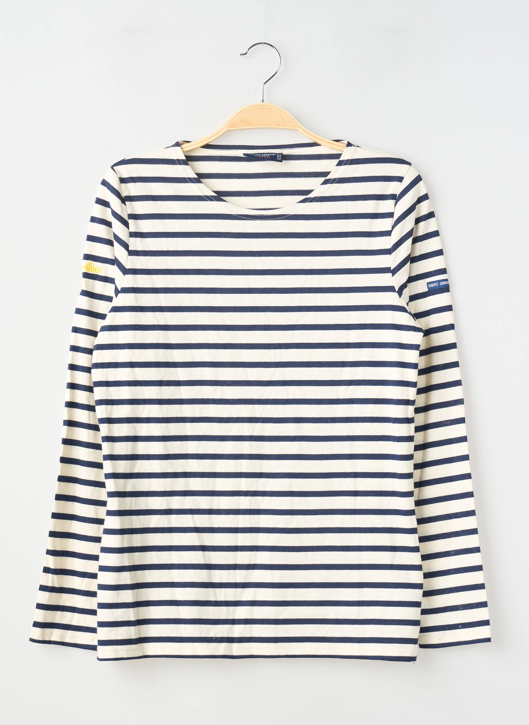 Voici une occasion à ne pas manquer pour ajouter une pièce iconique à votre dressing sans vous ruiner. Ce T-shirt à manches longues SAINT JAMES pour femme séduit par son allure indémodable avec ses rayures marinières bleu marine sur fond écru, son encolure bateau élégante et sa coupe légèrement ajustée. Parfait pour un look chic et décontracté, il apporte une touche authentique à petit prix, idéal pour allier style intemporel et économies.