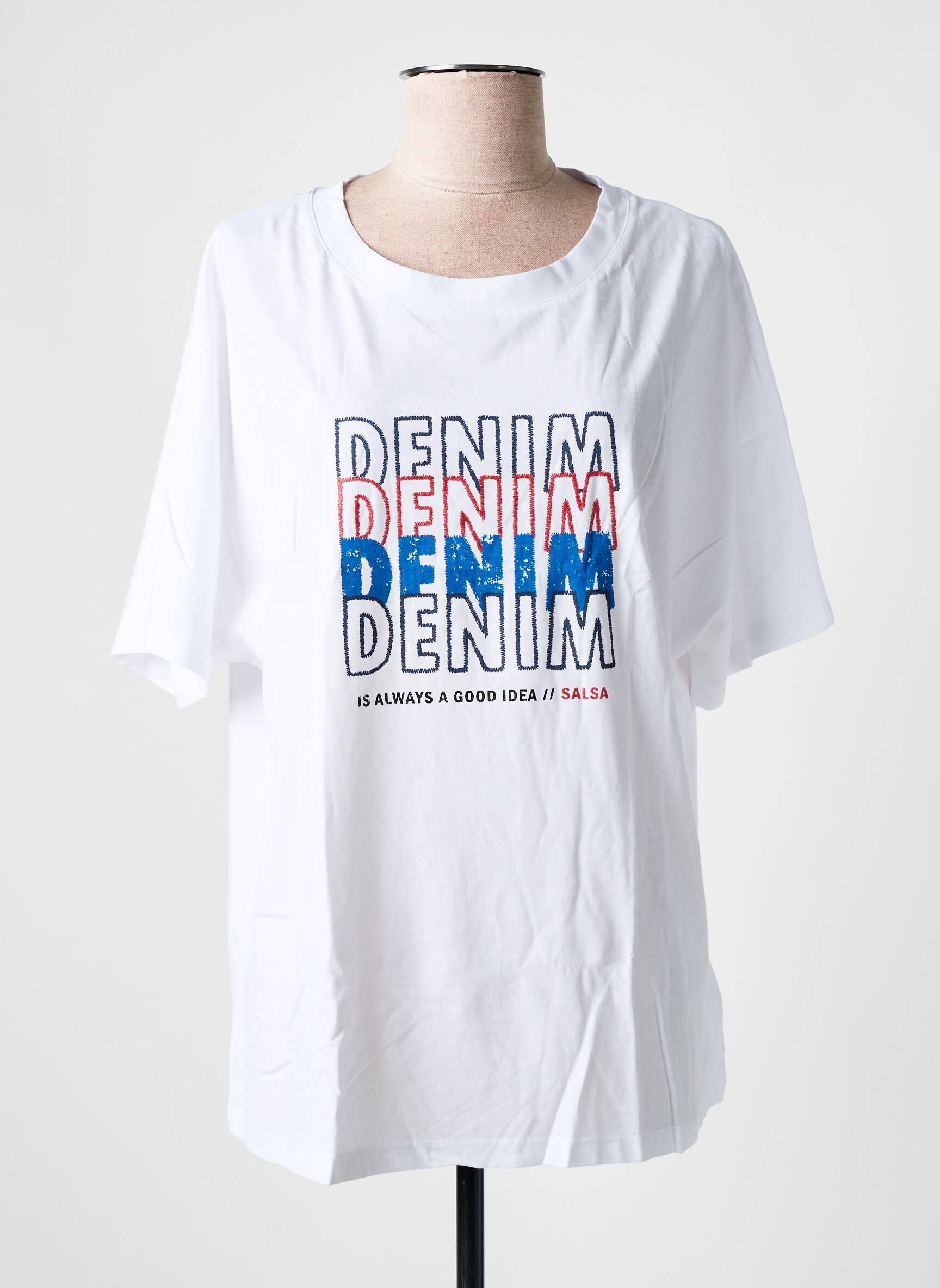 Profitez d’un véritable bon plan avec ce T-shirt pour femme de la marque SALSA, parfait pour apporter une touche de style à petit prix. Sa coupe décontractée, son coloris blanc intemporel et son imprimé graphique "DENIM" aux nuances de bleu et de rouge en font une pièce moderne et facile à porter au quotidien. Saisissez cette occasion d’ajouter une valeur sûre à votre dressing sans vous ruiner.