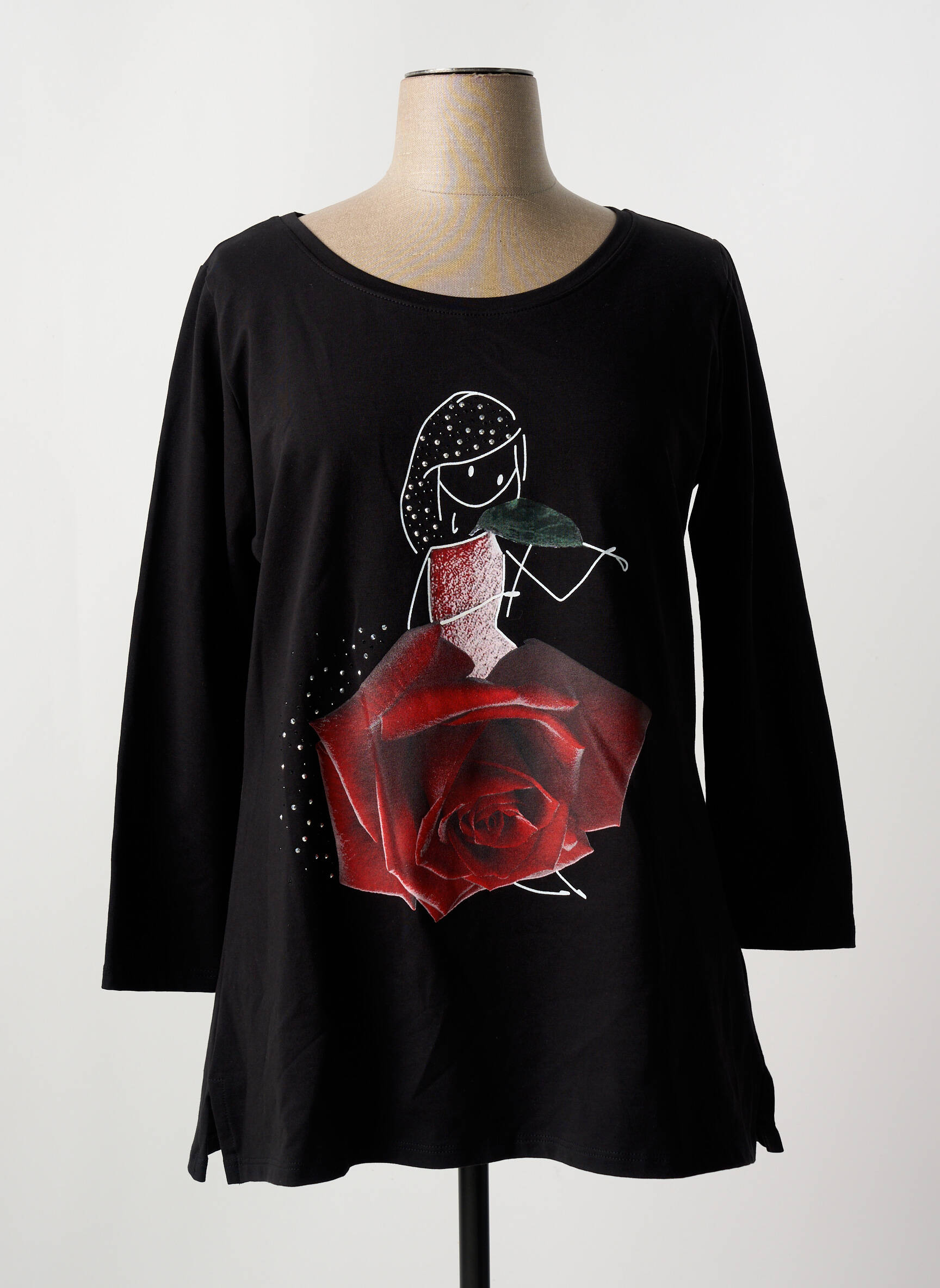 Pour un look tendance à petit prix, ce t-shirt SOPHIA CURVY pour femme est le bon plan du moment : il séduit par sa couleur noire intemporelle et son imprimé original représentant une silhouette féminine stylisée et une grande rose rouge, qui apporte une touche d’élégance et de fantaisie à toutes vos tenues. Idéal pour renouveler votre garde-robe sans vous ruiner, ce t-shirt à manches longues combine confort et style pour vous accompagner au quotidien avec un excellent rapport qualité-prix.
