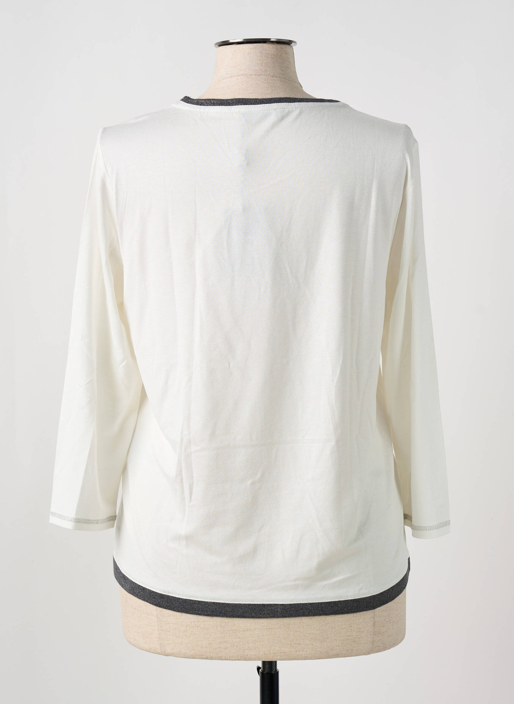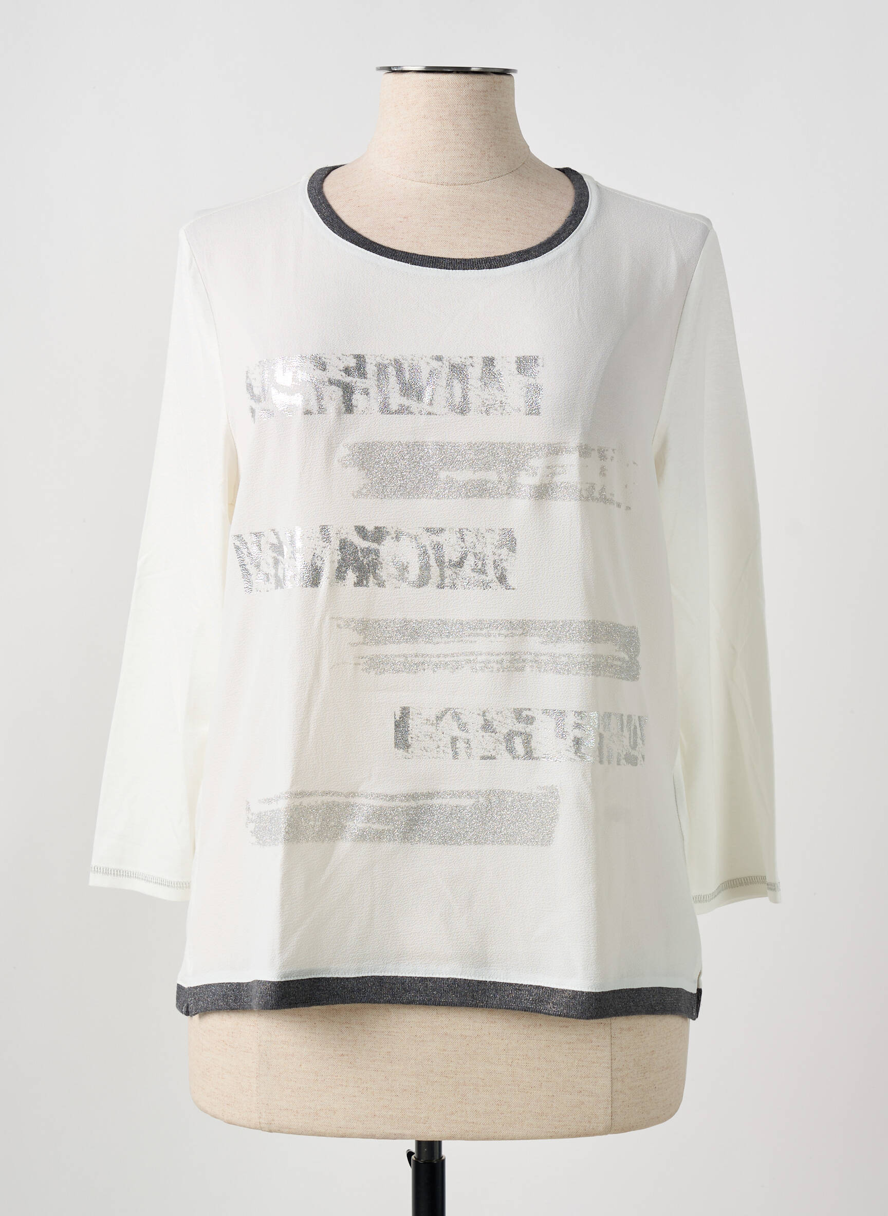 Profitez d’une belle affaire avec ce T-shirt Thomas Rabe pour femme à prix mini, parfait pour ajouter une touche tendance à votre dressing sans se ruiner. Ce modèle séduit par sa coupe confortable, son coloris blanc lumineux rehaussé de détails gris au col et à la base, ainsi que par son imprimé argenté discret sur le devant, pour un look moderne et décontracté à petit prix.