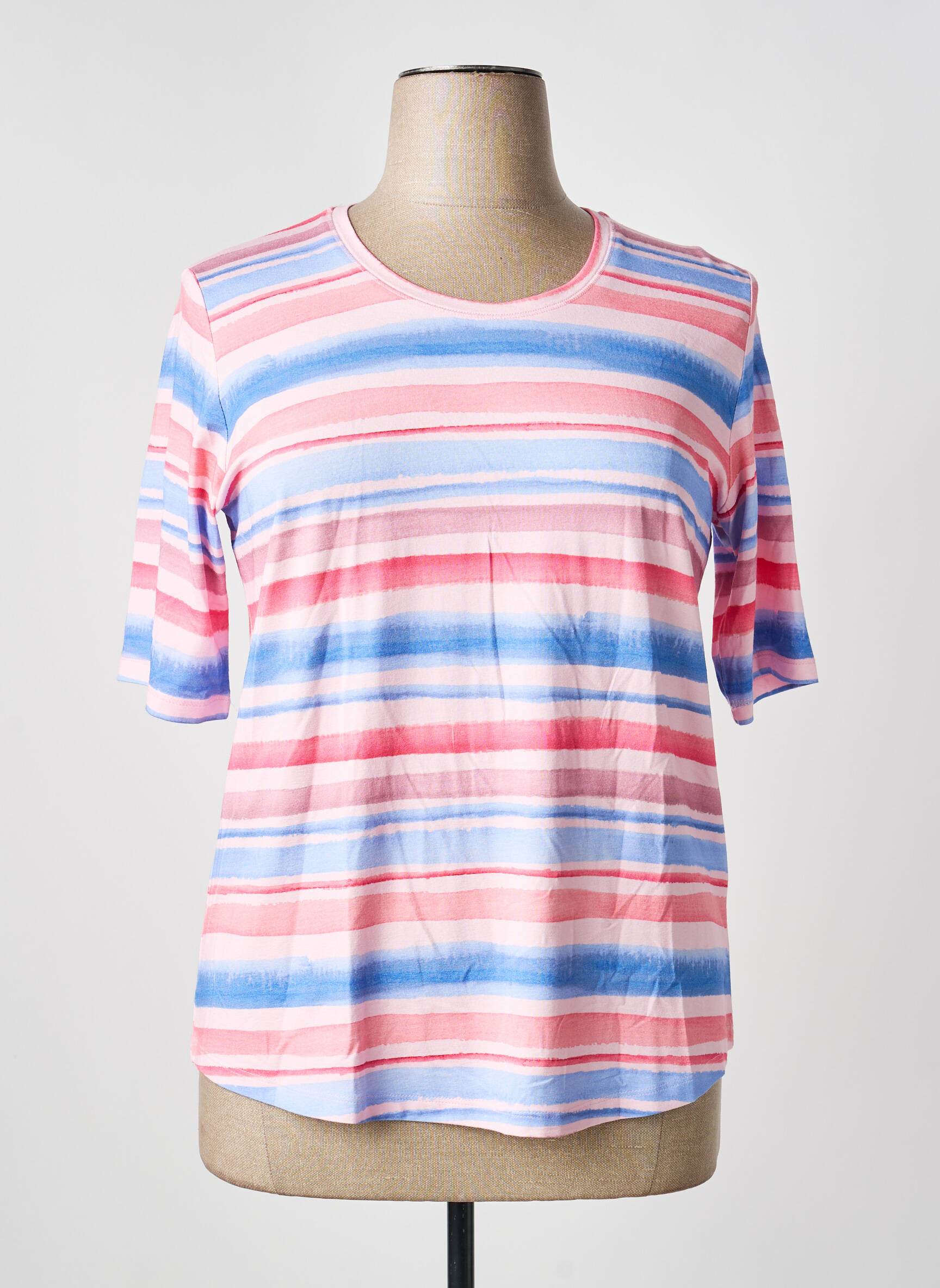 Profitez d’un vrai bon plan avec ce T-shirt femme de la marque Thomas Rabe, parfait pour apporter une touche de fraîcheur à votre dressing sans vous ruiner. Son imprimé à rayures dans des tons doux de bleu, rose et blanc lui confère un style à la fois moderne et décontracté, idéal pour le quotidien comme pour vos moments de détente. Sa coupe confortable et son encolure ronde promettent un porté facile et agréable, le tout à petit prix pour une allure tendance et accessible.