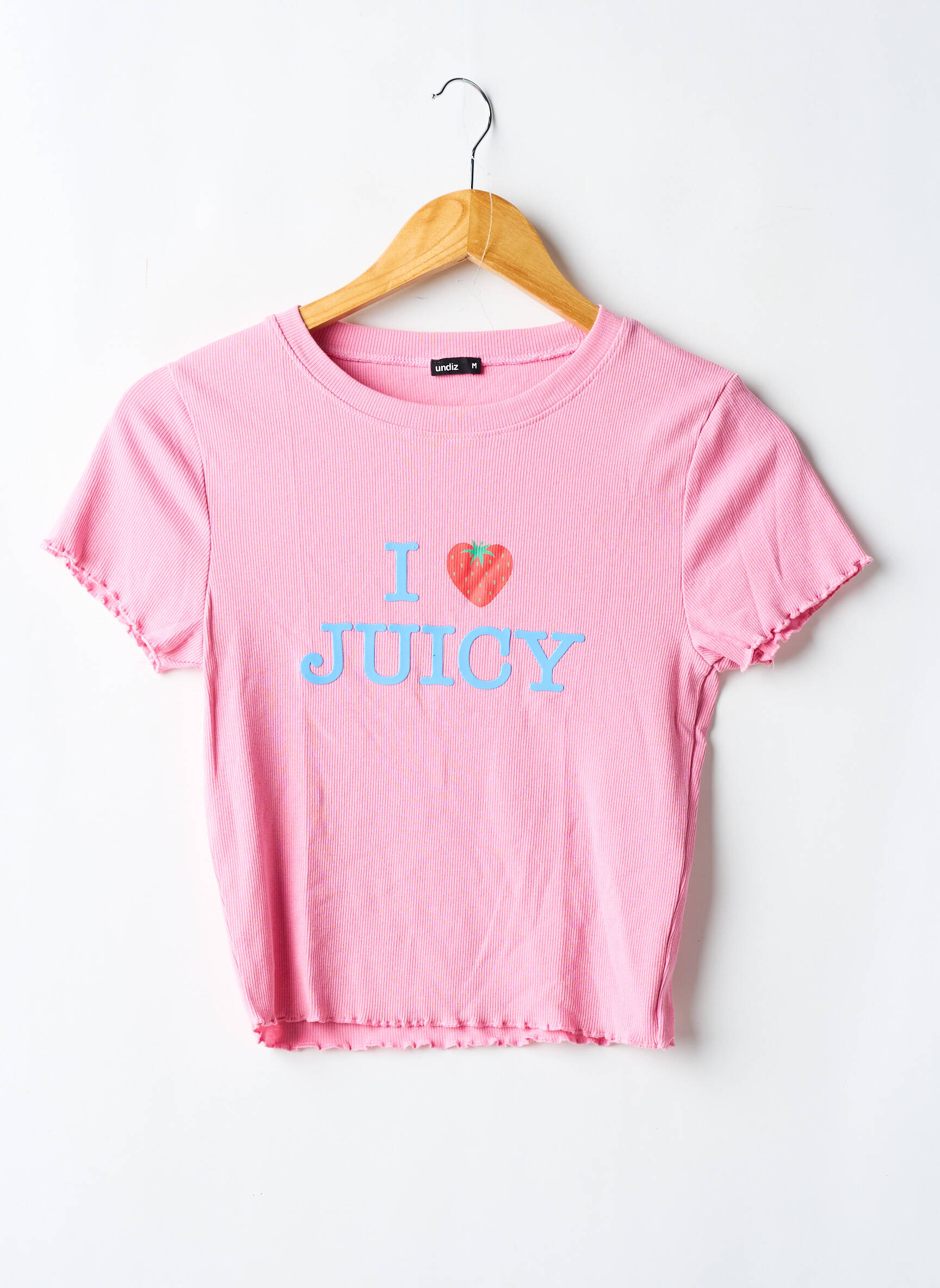 Craquez pour ce T-shirt UNDIZ pour femme, un vrai bon plan pour ajouter une touche fun et tendance à votre garde-robe sans vous ruiner. Sa couleur rose lumineuse alliée à un message "I ? Juicy" brodé en bleu et rouge apporte une dose de fraîcheur et d’originalité, tandis que sa coupe courte et ses finitions festonnées sur les manches soulignent un esprit décontracté et féminin, parfait pour twister tous vos looks du quotidien à petits prix.