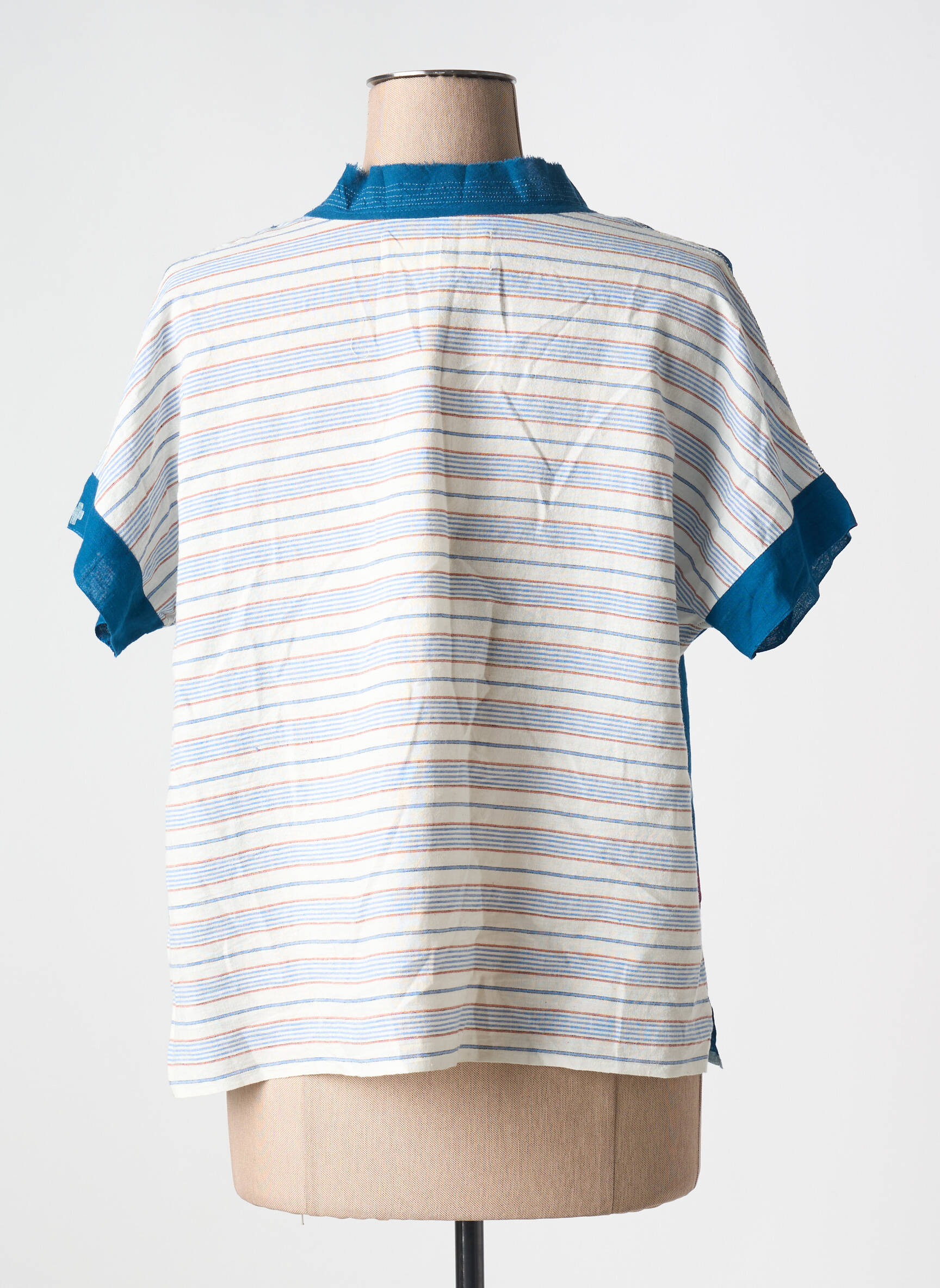 Profitez d’un véritable bon plan avec ce T-shirt femme V.DE.VINSTER, une pièce au style authentique et coloré à petit prix. Ce modèle bleu à la coupe ample séduit par son tissu léger et son col original, tandis que ses motifs graphiques aux touches de rouge et de blanc apportent une note artisanale et moderne, parfait pour égayer votre dressing sans vous ruiner.
