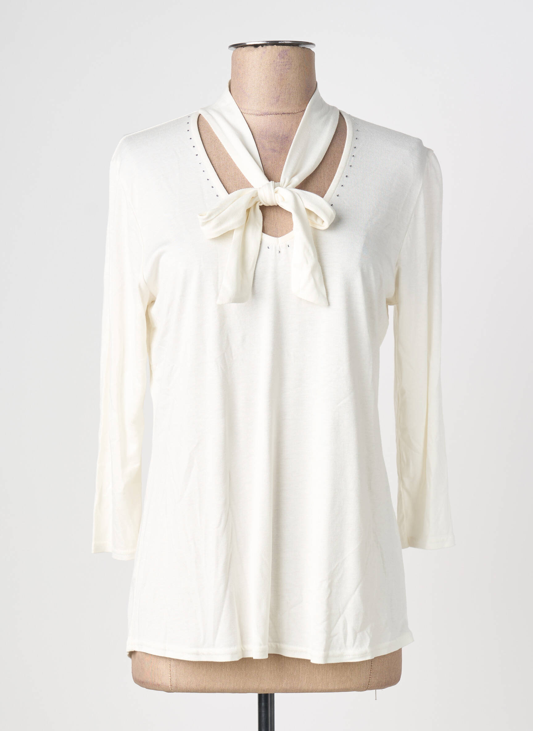 Profitez d’un bon plan avec ce T-shirt femme VIE NOCTURNE, parfait pour celles qui souhaitent allier style et économie. Ce modèle élégant se distingue par sa couleur crème lumineuse et son col original noué façon lavallière, qui apporte une touche féminine et raffinée. Les détails discrets de petits strass autour de l’encolure offrent une note de brillance tout en subtilité. Idéal pour apporter une note chic à votre dressing à petit prix, ce T-shirt deviendra vite un incontournable polyvalent pour toutes vos tenues.