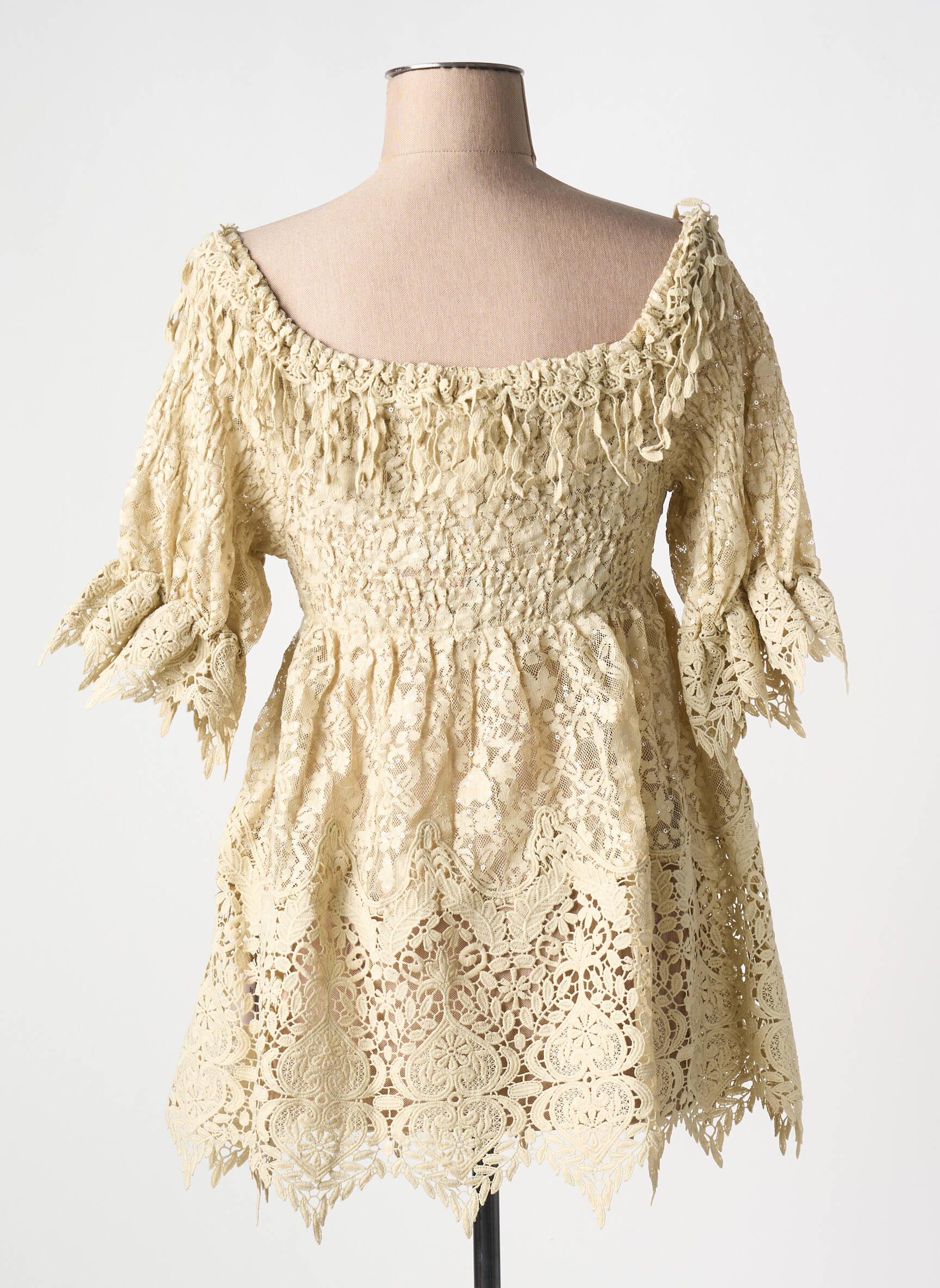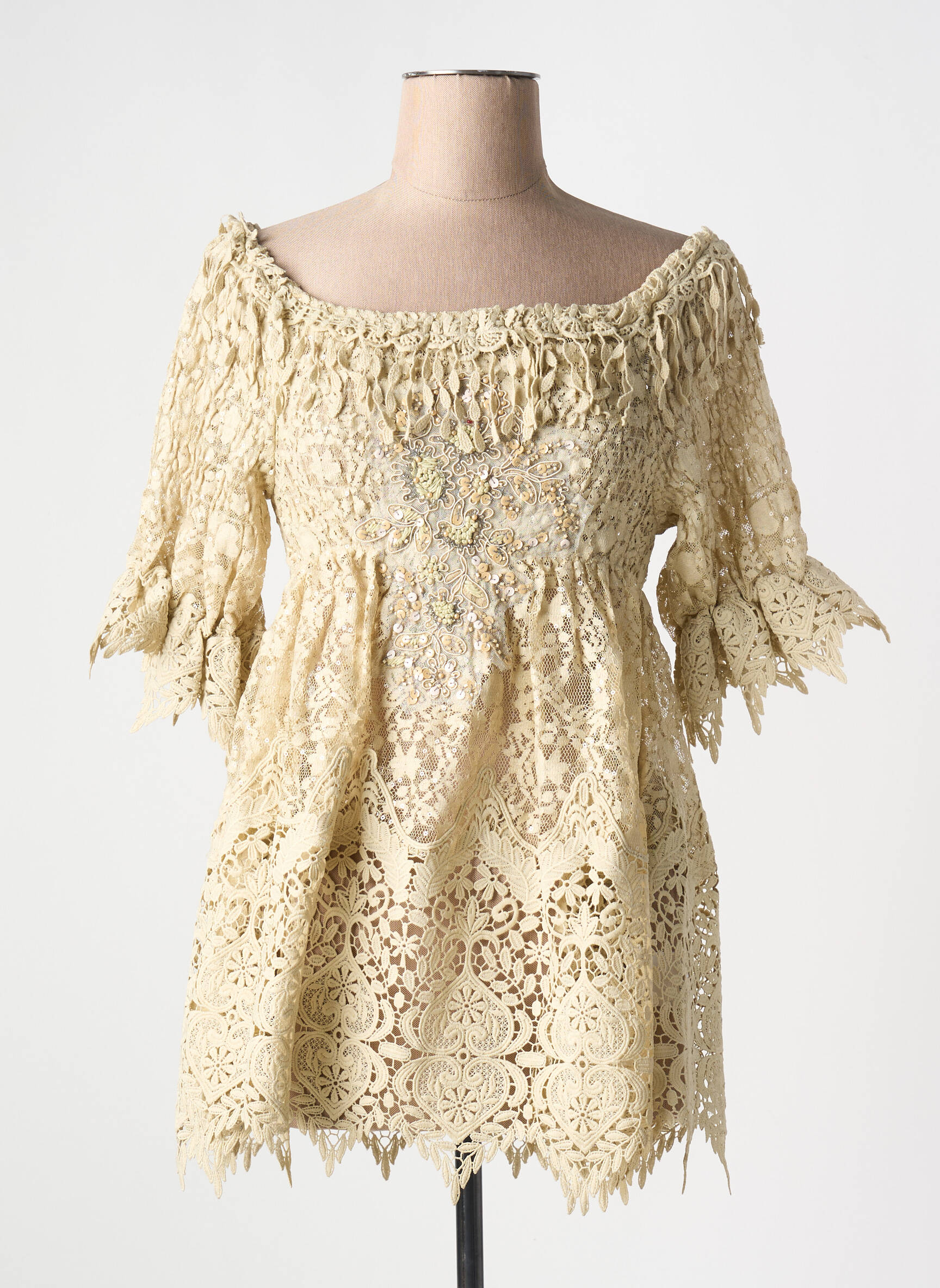 Profitez d'une occasion unique de vous offrir cette superbe tunique manches courtes BEATNIK PHILOSOPHY à prix mini, parfaite pour apporter une touche romantique à votre garde-robe sans vous ruiner. Son tissu ajouré façon dentelle et son encolure légèrement élastiquée offrent une silhouette féminine et délicate, tandis que les détails travaillés sur le bas et les manches donnent du caractère à votre tenue, le tout en conservant un style bohème-chic irrésistible. Une pièce coup de cœur à saisir pour allier style unique et économies.