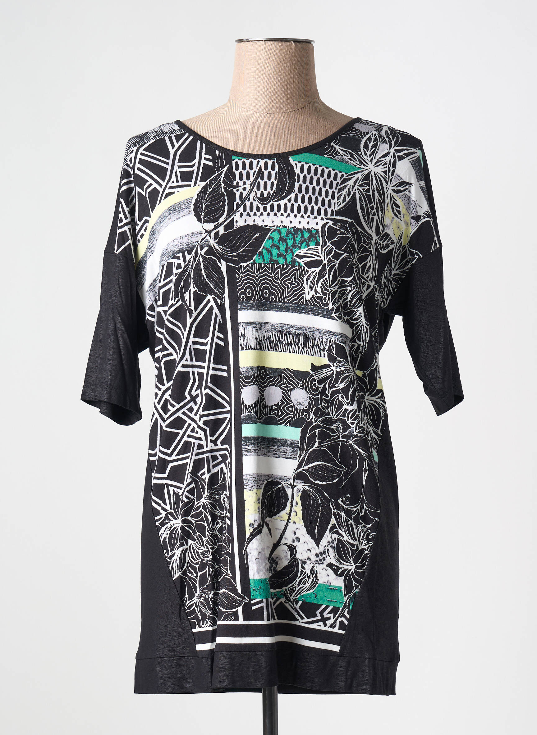 Craquez pour cette tunique manches courtes Gerry Weber à prix mini, une pièce tendance qui allie élégance graphique et confort au quotidien. Son imprimé original mêle des motifs géométriques et floraux dans des tons noirs, blancs et verts, pour un style moderne et raffiné qui dynamisera votre dressing à petit budget. Offrez-vous la qualité d’une grande marque sans vous ruiner grâce à ce bon plan exclusif.
