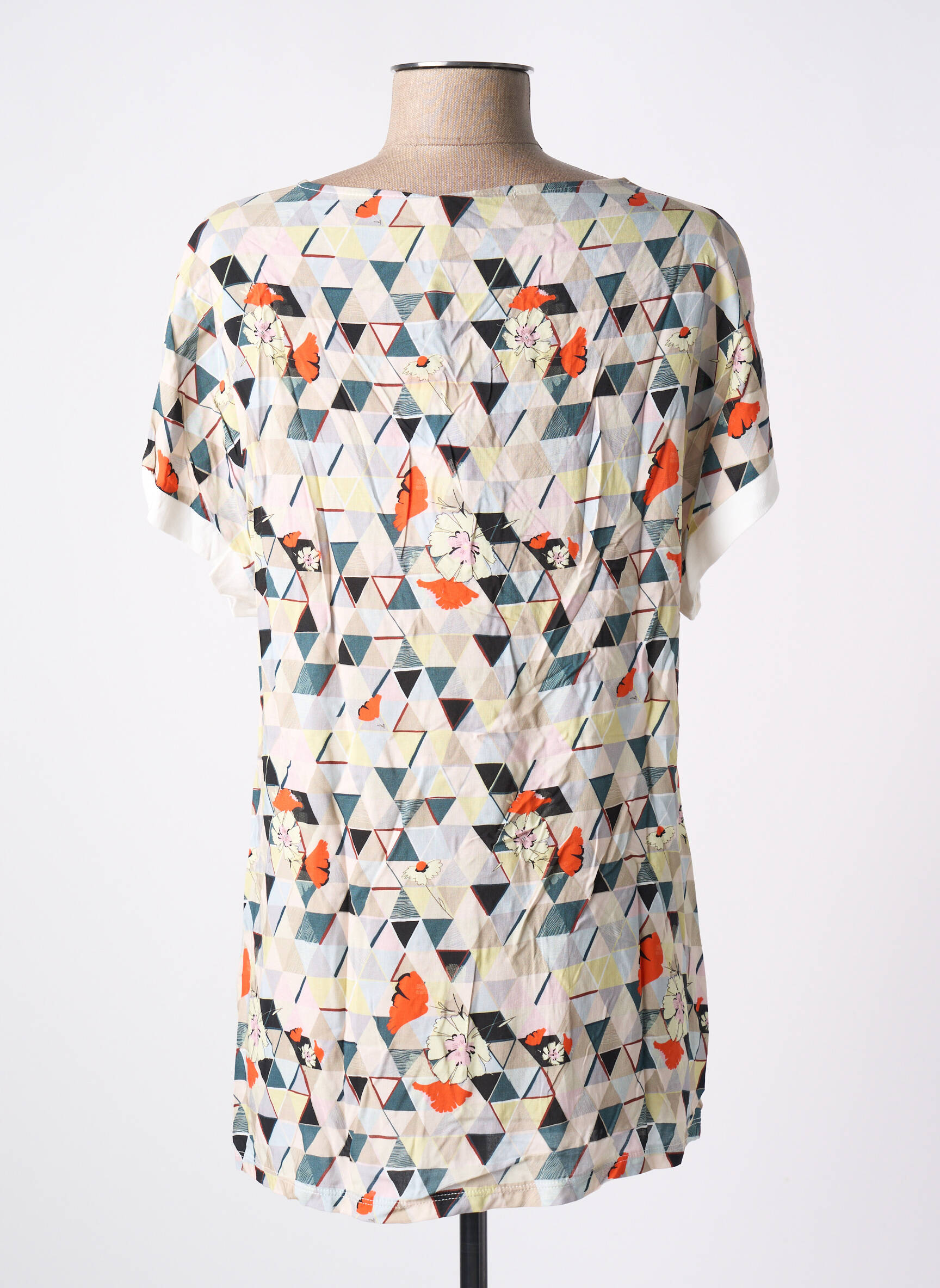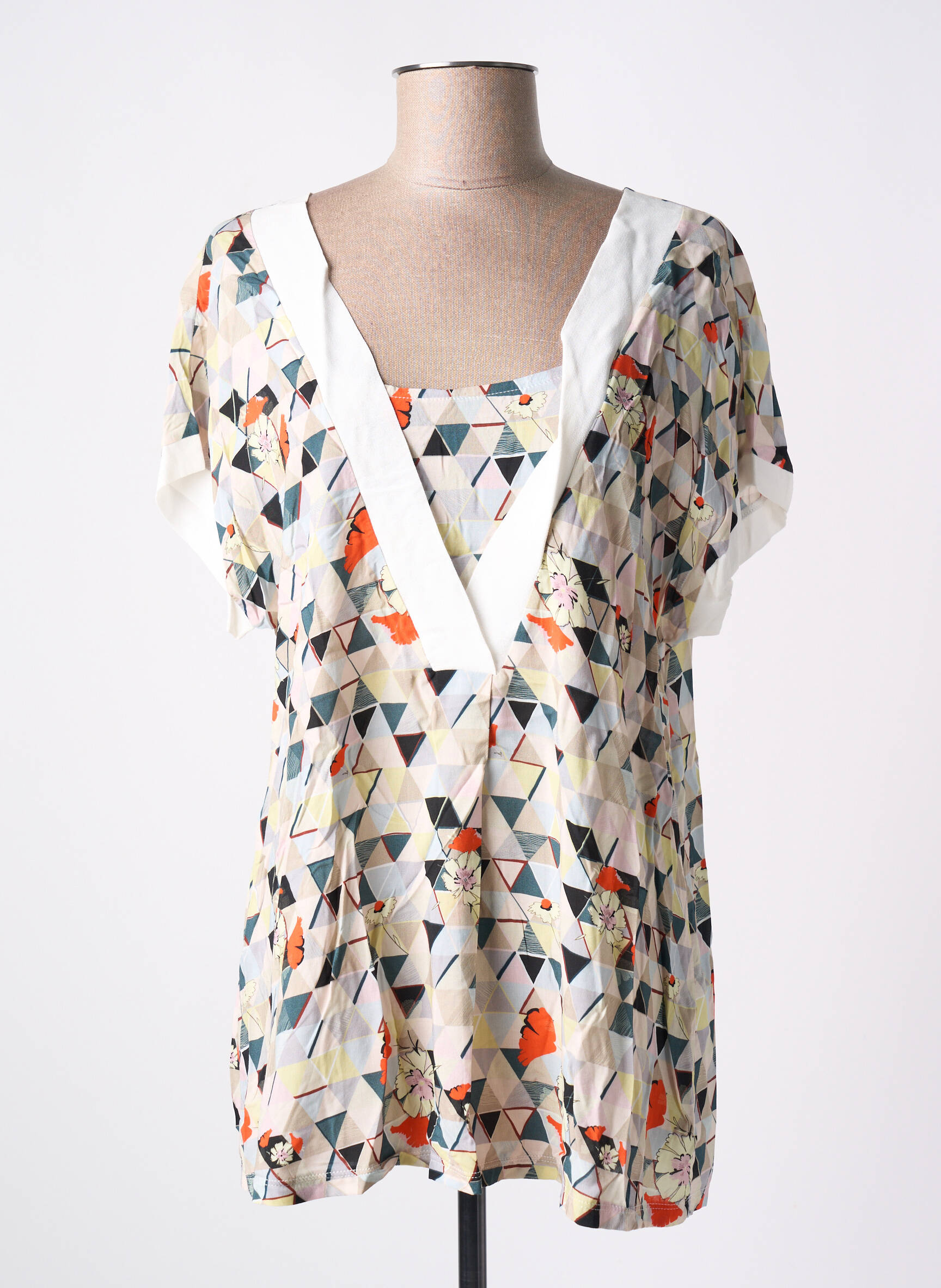 Dans un monde où les motifs s'entrelacent avec audace, la tunique à manches courtes de la marque MALOKA pour femme se démarque par son design captivant. Ornée d'un imprimé graphique mêlant triangles et fleurs colorées, elle évoque un souffle de fraîcheur et d'originalité. Le profond décolleté en V et les manches légèrement tombantes créent un drapé flatteur, alliant élégance et confort. Cette pièce versatile se prête aussi bien à une journée décontractée qu'à une soirée entre amis. Sa légèreté et son style unique en font un incontournable de votre garde-robe estivale.